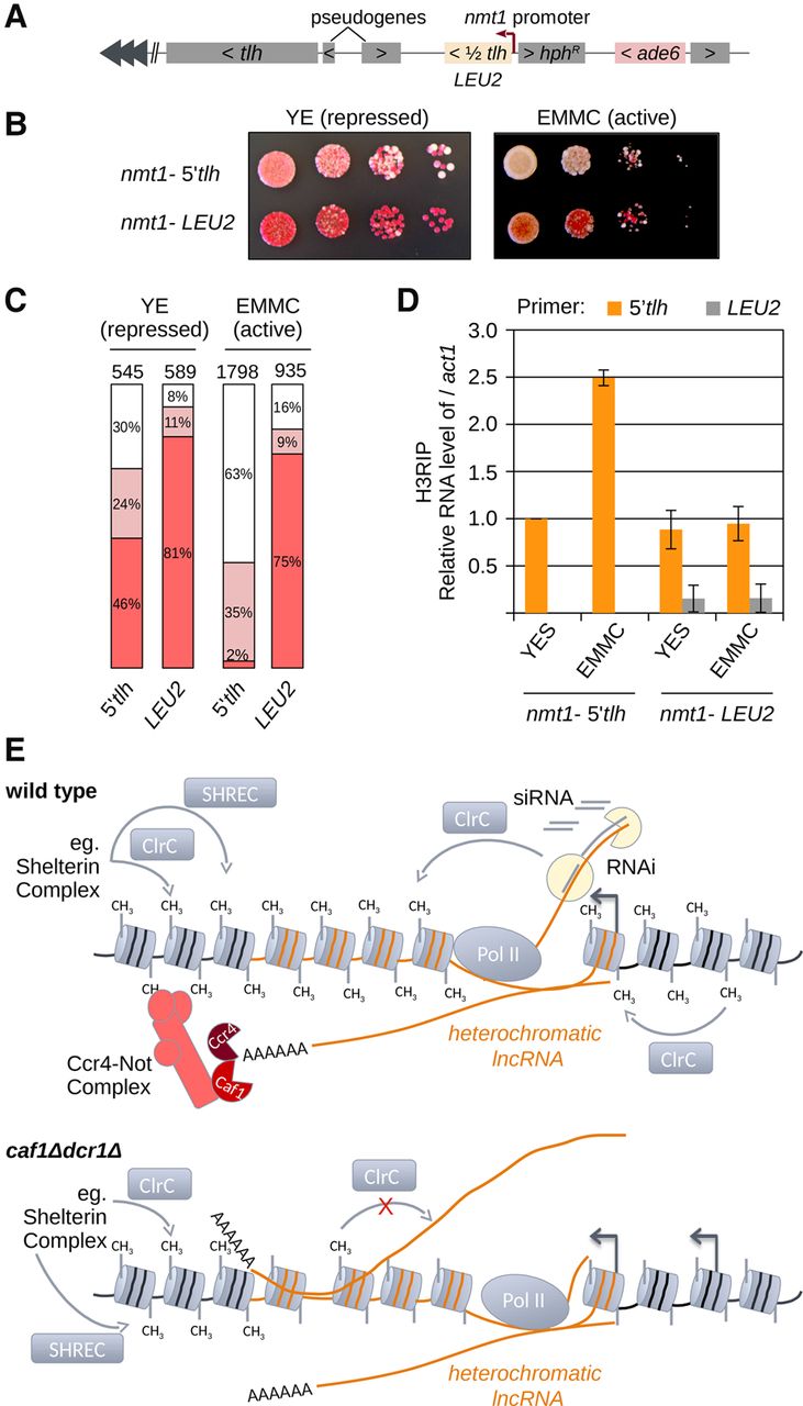 Accumulation of RNA on chromatin disrupts heterochromatin. (A) Scheme showing the constructs used. One half of tlh (5′tlh: first half; 3′tlh: second half) or LEU2 were inserted ∼5.5 kb upstream of tlh under the thiamine-inducible nmt1 promoter. The ade6 reporter gene was inserted 5 kb upstream of the inducible expression system. Cells that silence ade6 are red, while ade6-expressing cells are white when grown on low adenine plates. Heterochromatin maintenance of a silenced, red colony was analyzed for each strain on YE (low adenine, thiamine +) or EMMC low ade (10 mg/L adenine, thiamine −) plates. (B) Growth assay with ade6 reporter gene showing nmt1-5′tlh and nmt1-LEU2 cells. nmt1-5′tlh cells show strong loss of heterochromatic silencing when grown under inducible conditions. Expression of a control LEU2 gene did not lead to increased loss of heterochromatin when expression was induced. Cells were plated in 10-fold dilutions starting with 105 cells. (C) Quantification of different colored cells is shown for the indicated strains and expression, respectively. The total number of colonies counted is indicated above the bars. (D) Quantification of chromatin-associated RNA in indicated strains and conditions by H3 RIP RT-qPCR. In nmt1-5′tlh strains, 5′tlh RNA is enriched at chromatin in EMMC (induced) compared with YES medium (repressed). In nmt1-LEU2 strains, neither tlh nor LEU2 RNA is changed upon induction of LEU2 expression. (E) RNAi or Shelterin complex recruit the CLRC methyltransferase and SHREC deacetylase complexes to establish heterochromatin in wild-type cells. CLRC and SHREC spread into repeats to establish heterochromatin. The Ccr4-Not complex eliminates heterochromatic RNA and promotes spreading over the transcribed region. In the absence of the Ccr4-Not complex and RNAi, heterochromatic transcripts accumulate on the chromatin. This leads to loss of heterochromatin. At the transcribed loci, heterochromatin is lost in caf1Δdcr1Δ cells, indicating that at transcribed regions, RNA degradation is required for heterochromatin assembly.