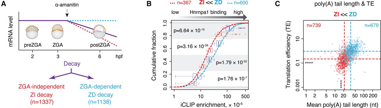 Hnrnpa1 preferentially associates with ZGA-dependent decay genes. (A) Schematic representation of two distinct decaying gene groups. All decaying maternal mRNAs are shown by a purple line. Among those, ZGA-independent (ZI) decay genes (red dashed line) do not require zygotic transcription for their destabilization and continuously decay upon α-amanitin treatment. ZGA-dependent (ZD) decay genes (blue dashed line) require zygotic transcriptional activity for their clearance, thereby remaining stable in α-amanitin treated embryos. The total number of identified ZI and ZD decay genes is indicated. (B) Cumulative plot showing the fraction of ZI (red dashed line) and ZD (dashed blue line) decay genes (y-axis) and their respective Hnrnpa1 iCLIP enrichment (x-axis). Box plots in the background show the distribution of iCLIP enrichment per each quartile for ZI and ZD decay genes. Indicated P-values were derived from pairwise comparison of ZI (red) and ZD (blue) decay genes within each quartile (Wilcoxon rank test). (C) Scatterplot showing differences in poly(A) tail length and TE of ZI and ZD decay genes. Red and blue dashed lines refer to the median of poly(A) tail length and TE for ZI and ZD decay genes, respectively. The number of genes in each group is indicated: (****) P < 2.2 × 10−16 (Wilcoxon rank test).