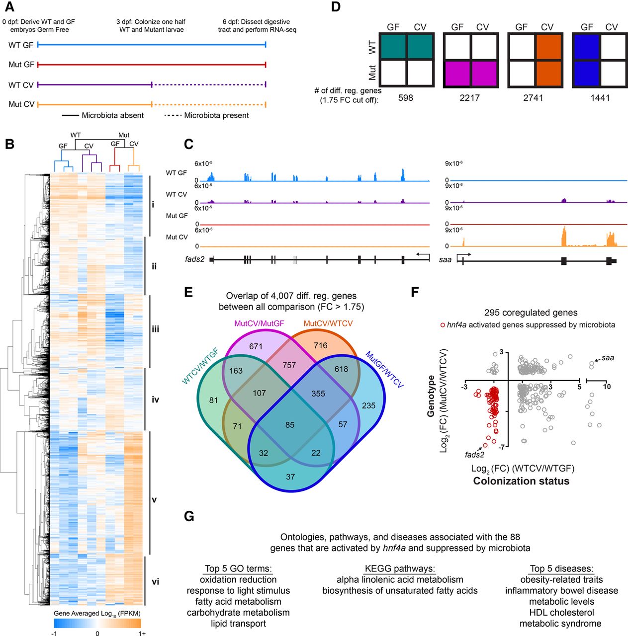 Hnf4a activates the majority of coregulated genes that are suppressed by the microbiota. (A) Schematic showing the experimental timeline for zebrafish digestive tract GF and CV hnf4a+/+ [WT] and hnf4a−/− [Mut] RNA-seq experiment (n = 3 for WTCV and WTGF and n = 2 for MutCV and MutGF). (B) Hierarchical relatedness tree and heat map of differentially regulated genes in mutant and gnotobiotic zebrafish digestive tracts. Gene averaged log10 FPKMs for the biological replicates are represented for each of the 4007 differentially regulated genes. (C) Representative RNA-seq signal tracks at fatty acid-desaturase 2 (fads2) and serum amyloid a (saa) loci. (D) Summary of the total number of differentially expressed genes between indicated conditions (GF and CV) and genotype (WT and hnf4a−/− [Mut]). (E) Four-way Venn diagram showing overlaps between all 4007 differentially regulated genes. (F) The 295 coregulated genes were plotted using the log2 (FC) calculated in the WTGF/WTCV comparison (x-axis) and WTCV/MutCV (y-axis). The 88 out of 98 genes that are activated by Hnf4a but suppressed by the microbiota are highlighted (red) and (G) their GO term, KEGG pathway, and disease associations are listed. See also Supplemental Figure S3.