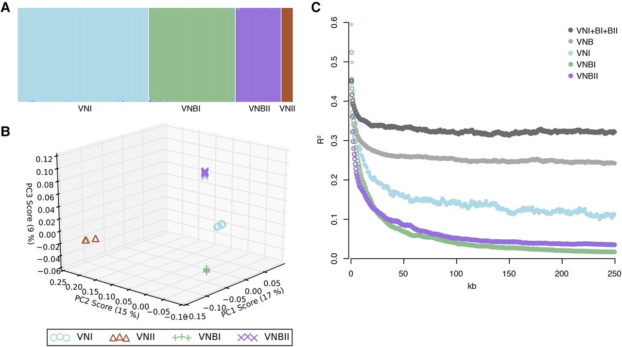 C. neoformans var. grubii is separated into four distinct nonrecombining lineages: VNI, VNII, VNBI, and VNBII. (A) Results of STRUCTURE analysis (k = 4) shows separation of all four lineages. (B) Top three principal components from PCA. The third principal component clearly separates VNBI from VNBII. (C) Decay of linkage disequilibrium (LD) shows similar rates of recombination within groups and lack of recombination between groups. LD (R2) was calculated for all pairs of SNPs separated by 0–250 kb and then averaged for every 500 bp. LD values for each window were then calculated by averaging over all pairwise calculations in the window. The chromosome with the mating type locus was excluded from the calculations.