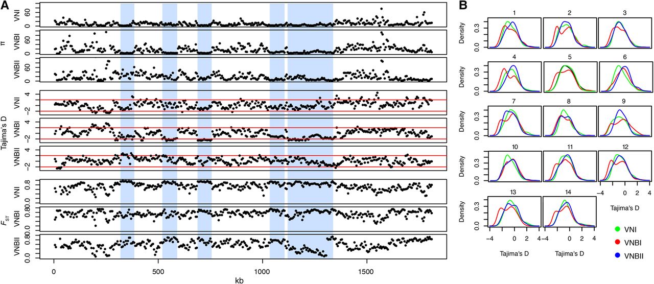 Population genomic analysis revealed long tracts of low genetic diversity and Tajima's D in VNI and VNBI. (A) Low diversity tracts are shown here in Chromosome 5. In VNBI, these tracts are interspersed between regions of high diversity. Vertical blue bars highlight these areas of reduced diversity and Tajima's D in VNBI, which are generally accompanied by high FST between populations. Statistics shown include π, Tajima's D, and FST. (B) Density distribution of Tajima's D across all 14 chromosomes for VNI, VNBI, and VNBII. VNI and VNBII show predominantly unimodal distributions for most chromosomes, and VNBI shows a bimodal distribution for all chromosomes except Chromosome 6.