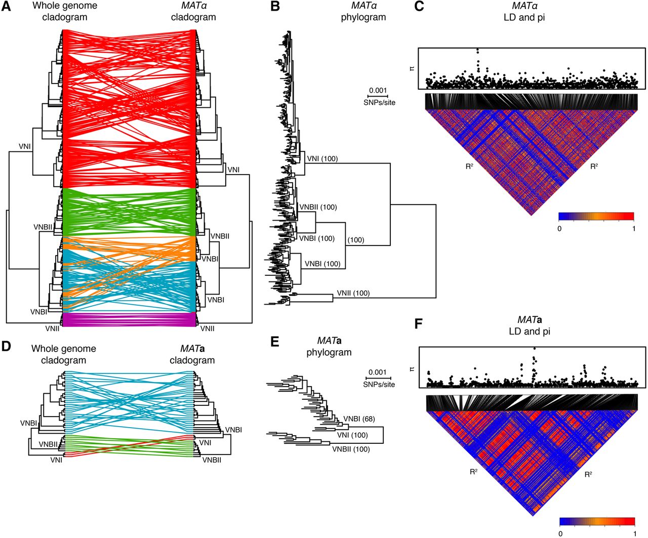 Phylogenetic and linkage analyses reveal distinct evolutionary trajectories of the MAT locus alleles. (A) The topology of the whole-genome phylogeny and MATα phylogeny are compared as cladograms. VNBI isolates contain two distinct α alleles. (B) MATα phylogram showing branch lengths and bootstrap support for major clades. (C) Linkage disequilibrium (R2) and diversity (π) across the MATα locus. (D) Topology of the whole-genome phylogeny and MATa phylogeny are compared as cladograms. (E) MATa phylogram showing branch lengths and bootstrap support for major clades. VNI is a close sister group to VNBI, in contrast to the whole-genome phylogeny, and there is limited support for monophyly of the VNI MATa allele with respect to VNBI (bootstrap support: 68%). (F) Linkage disequilibrium (R2) and diversity (π) across the MATa locus.