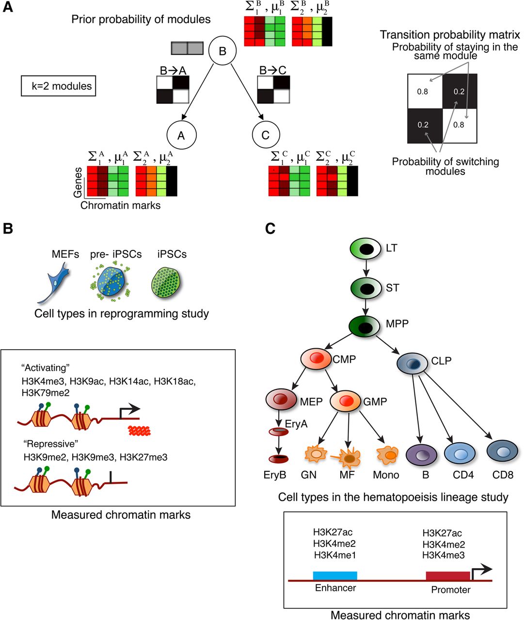 The CMINT approach. (A) The generative model of the CMINT approach. The model is made up of two parts: the first part corresponds to a mixture of P-dimensional Gaussians, one dimension for each mark. The second part specifies the transition probabilities of genes (black-white matrices) switching modules between a cell type and its predecessor. Each circle on the tree corresponds to a cell type. All cell types other than the root cell type (e.g., the starting differentiated cell type) have a k × k matrix of conditional probabilities. The starting cell type only has an initial prior probability distribution of module assignments (gray boxes). (B) The reprogramming system: (MEFs) mouse embryonic fibroblasts; (pre-iPSCs) partially reprogrammed induced pluripotent stem cells; (iPSCs) induced pluripotent stem cells. Bottom: Histone H3 lysine (K) modifications assessed by ChIP-chip analysis, listed according to their association with transcriptional activation or repression when present alone. (C) The hematopoietic system: (LT) long-term hematopoietic stem cells; (ST) short-term hematopoietic stem cells; (MPP) multipotent progenitor; (CMP) common myeloid progenitor; (MEP) megakaryocyte erythrocyte precursor; (EryA) immature erythrocytes; (EryB) mature erythrocytes; (GMP) granulocyte monocyte precursor; (GN) granulocyte; (MF) macrophage; (Mono) monocyte; (CLP) common lymphoid progenitor; (B) B lymphocyte; (CD4) CD4 T lymphocyte; (CD8) CD8 T lymphocyte. Bottom: Histone modifications profiled in Lara-Astiaso et al. (2014) and their known localization pattern.