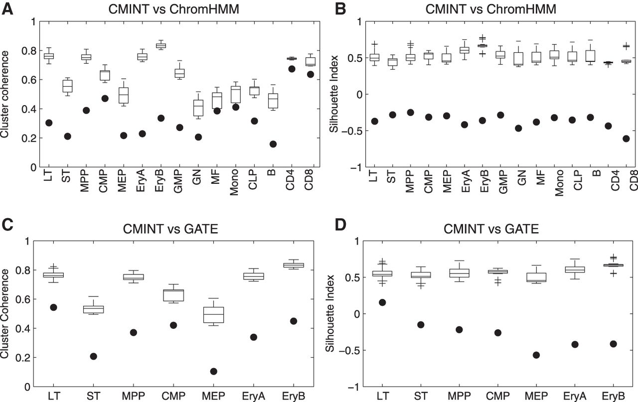 Comparison of CMINT against ChromHMM and GATE on 15 cell types of the hematopoiesis lineage. Cluster coherence (A) and silhouette index (B) of clusters generated by using ChromHMM and CMINT. The filled circles represent the cluster coherence and silhouette index values for ChromHMM. The box plots represent the values obtained using CMINT on 20 different random initializations. Cluster coherence (C) and silhouette index (D) of clusters generated by using GATE and CMINT on one branch of hematopoietic tree. The filled circles represent the silhouette index and cluster coherence values for GATE. The box plots represent the values obtained by CMINT for 20 different runs of the algorithm.