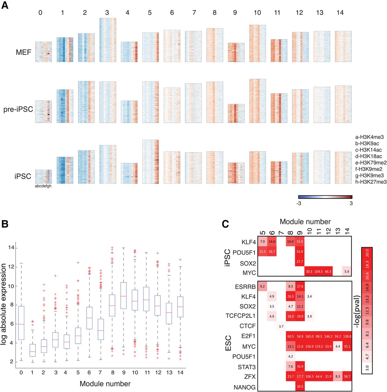 Chromatin modules in the reprogramming cell types identified by CMINT. (A) Heatmaps of 15 chromatin modules ordered from 0–14, obtained from CMINT: (top) MEFs; (middle) pre-iPSC; (bottom) iPSC. Each row in each heatmap represents one gene; each column represents one histone modification. (Red) enriched; (blue) depleted as compared to input. Height of each module is roughly proportional to the number of genes. (B) Box plots of gene expression of genes in each of the chromatin modules in iPSC. (C, top) Enrichment of reprogramming factors in the iPSC modules based on ChIP-chip data from iPSCs; (bottom) enrichment of pluripotency factors in the iPSC modules based on ChIP-seq data from ESCs.
