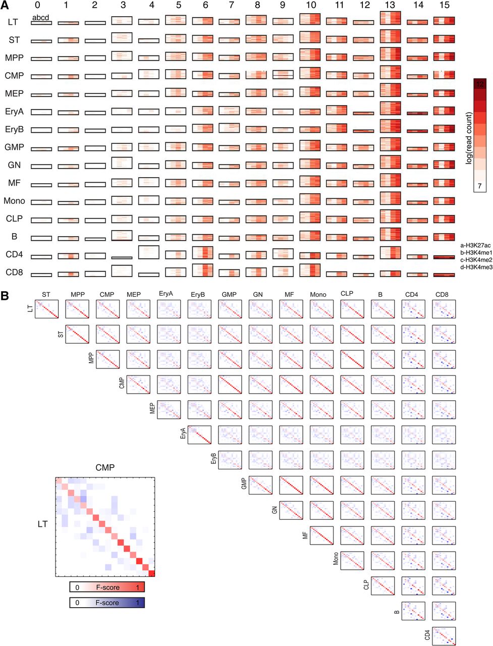 CMINT modules identified on the hematopoiesis cell lineage when applied to a subset of regions containing measurements for all histone modifications. (A) Heatmaps of 16 chromatin modules numbered from 0 to 15, obtained from CMINT restricted to 2000-bp regions with a non-zero value for each of the four histone modifications. Each row in each heatmap represents one region; each column represents one histone modification: (red) enriched; (white) depleted. The height of each module is roughly proportional to the number of regions within it. (B) Plot of similarity of module membership of regions, in which similarity was measured based on F-score, between each pair of cell types. Two different scales are used: (red) similarity for modules with similar patterns (diagonal entries); (blue) similarity for modules with different patterns (off-diagonal entries). The more red or blue an entry, the more similar are the matrices.