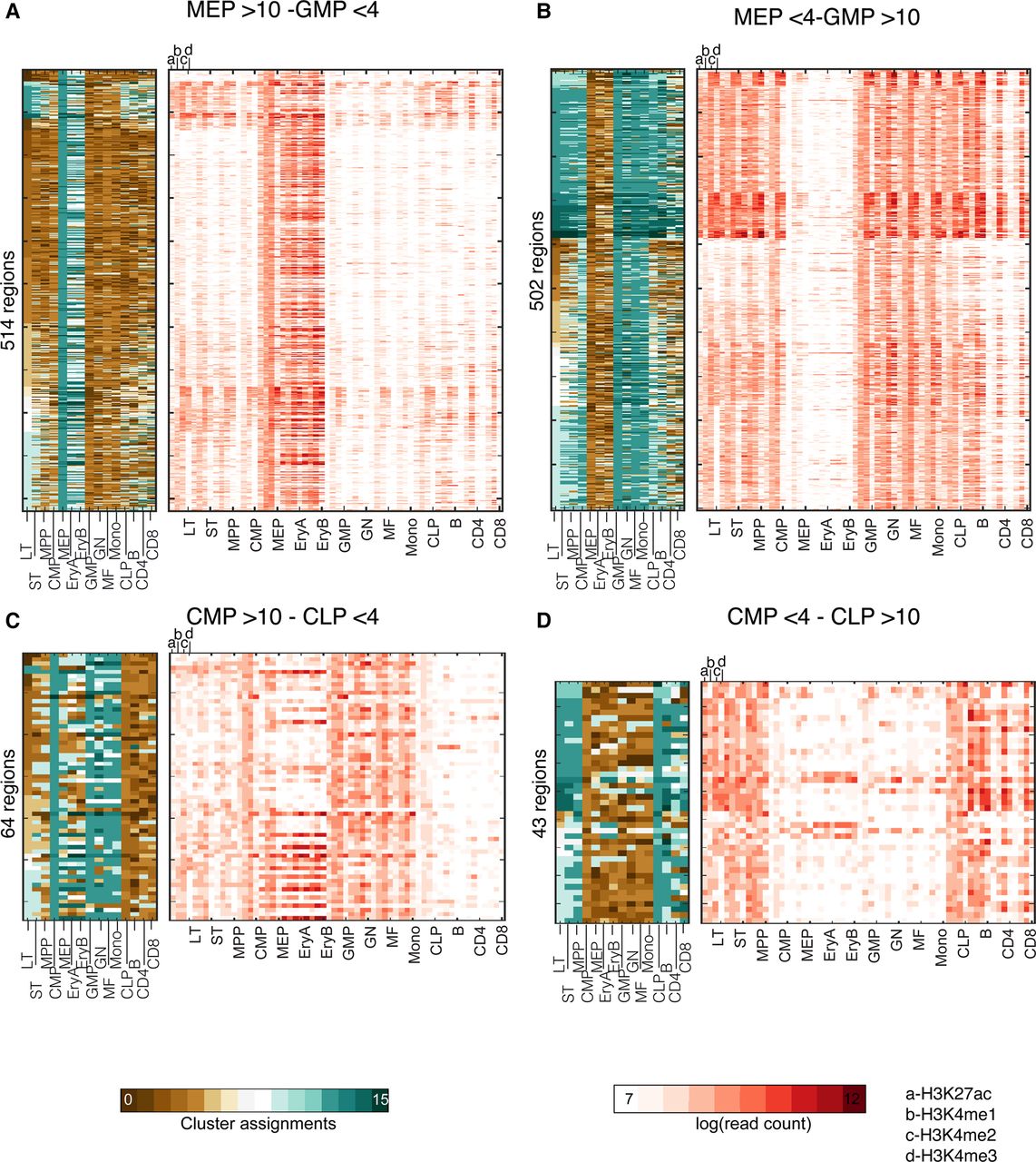 Rule-based analysis of hematopoiesis CMINT modules identifies regions associated with chromatin state transitions at different lineage points. (A, left) Regions that belong to modules enriched for marks (numbered greater than 10) in MEP and depleted for marks (less than 4) in GMP and their module assignments in other cell types. (Right) Histone modification level in the regions that obey the MEP > 10 and GMP < 4 module membership rule. (B) Similar to A, but for regions that obey the GMP > 10 and MEP < 4 rule. (C) As in A, but for regions that obey the CMP > 10 and CLP < 4 rule. (D) As in A, but for regions that obey the opposite rule, CLP > 10 and CMP < 4.
