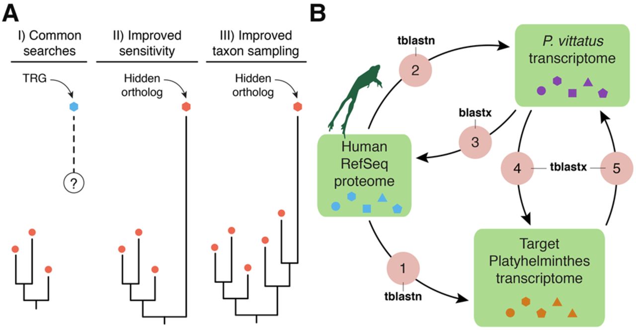 Hidden orthologs and the Leapfrog pipeline. (A) Taxonomically restricted genes (TRGs) are genes with no clear orthology relationship (dashed line and question mark) to other known genes (e.g., orthology group of red dots). Improved sensitivity in the detection methods and/or improved taxon sampling can help uncover hidden orthology relationships, thus referring to these former TRGs as hidden orthologs. (B) The Leapfrog pipeline performs a series of reciprocal BLAST searches between an initial well-annotated data set (e.g., human RefSeq), and a target and a “bridge” transcriptome. First, Leapfrog performs BLAST against the human RefSeq and the target (1) and the “bridge” transcriptome (2) and identifies reciprocal best-hit orthologs between the “bridge” and the human RefSeq proteins (3). These annotated genes of the “bridge” are then used to find orthologs in the target transcriptomes by reciprocal best BLAST hits (4 and 5). If these two pairs of reciprocal best BLAST hit searches are consistent between them, the gene in the target transcriptome is deemed a hidden ortholog. Colored shapes within green boxes represent different sequences of each data set.