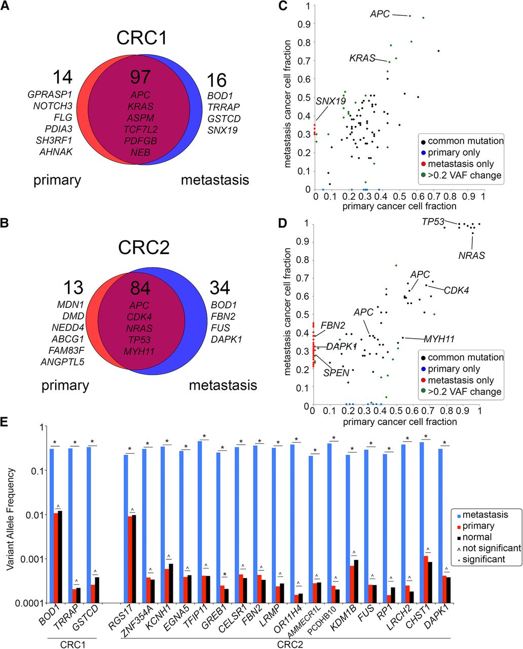 Concordance of mutations in bulk primary and metastatic tumors. (A,B) Scaled Venn diagrams reflect the total number of mutations (synonymous and nonsynonymous) identified by exome sequencing of the bulk flow-sorted tumor cells from the primary and metastatic tumors. (C,D) Dot plots showing the variant allele frequencies of the nonsynonymous mutations in the primary and metastatic tumors. (E) Targeted deep amplicon sequencing of the metastasis-specific mutations in the primary tumor and matched normal tissue. Significance of the mutations based on the variant read counts was determined using deepSNV and a Bayesian hypothesis test (Methods).