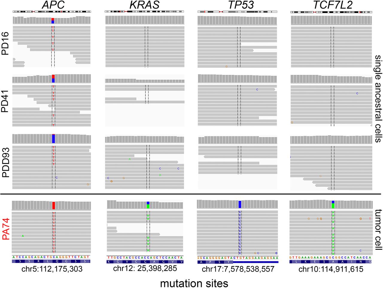 Early APC progenitor cells detected in CRC1. Raw sequencing reads and variant alleles are plotted for three diploid APC progenitor cells (PD16, PD41, PDD93) and one representative primary tumor cell (PA74) from the major tumor population at genomic regions where mutations were detected in APC, KRAS, TP53, and TCF7L2. Plots and read counts were generated using the Integrative Genomics Viewer (IGV).