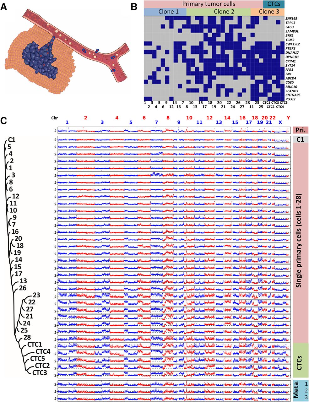 Evolution of SNVs and large-scale CNAs in primary tumor cells and CTCs. (A) Schematic diagram of the manner in which primary tumor cells intravasate and become CTCs. (B) SNV loci of primary tumor cells and CTCs. The distribution of 20 nonsynonymous mutations was assessed in 28 primary tumor cells (Cells 1–28) and five CTCs (CTCs 1–5) from a colon cancer patient (blue box, mutant; gray box, wild type). Three clones of cells were present according to a probabilistic modeling-based approach. (C) CNA patterns of the primary tumor, one control leukocyte (C1), single primary tumor cells, CTCs, and three lymph node metastases. (Pri.) Primary tumor, (Meta.) metastases. The copy numbers (blue and red dots) are plotted along the genome at a bin size of 500 kb. The ordinate coordinate represents copy numbers ranging from 0 to 6 (a copy number of >6 copies is set to 6). Phylogenetic tree on the left was constructed based on the segmented copy numbers of single cells.