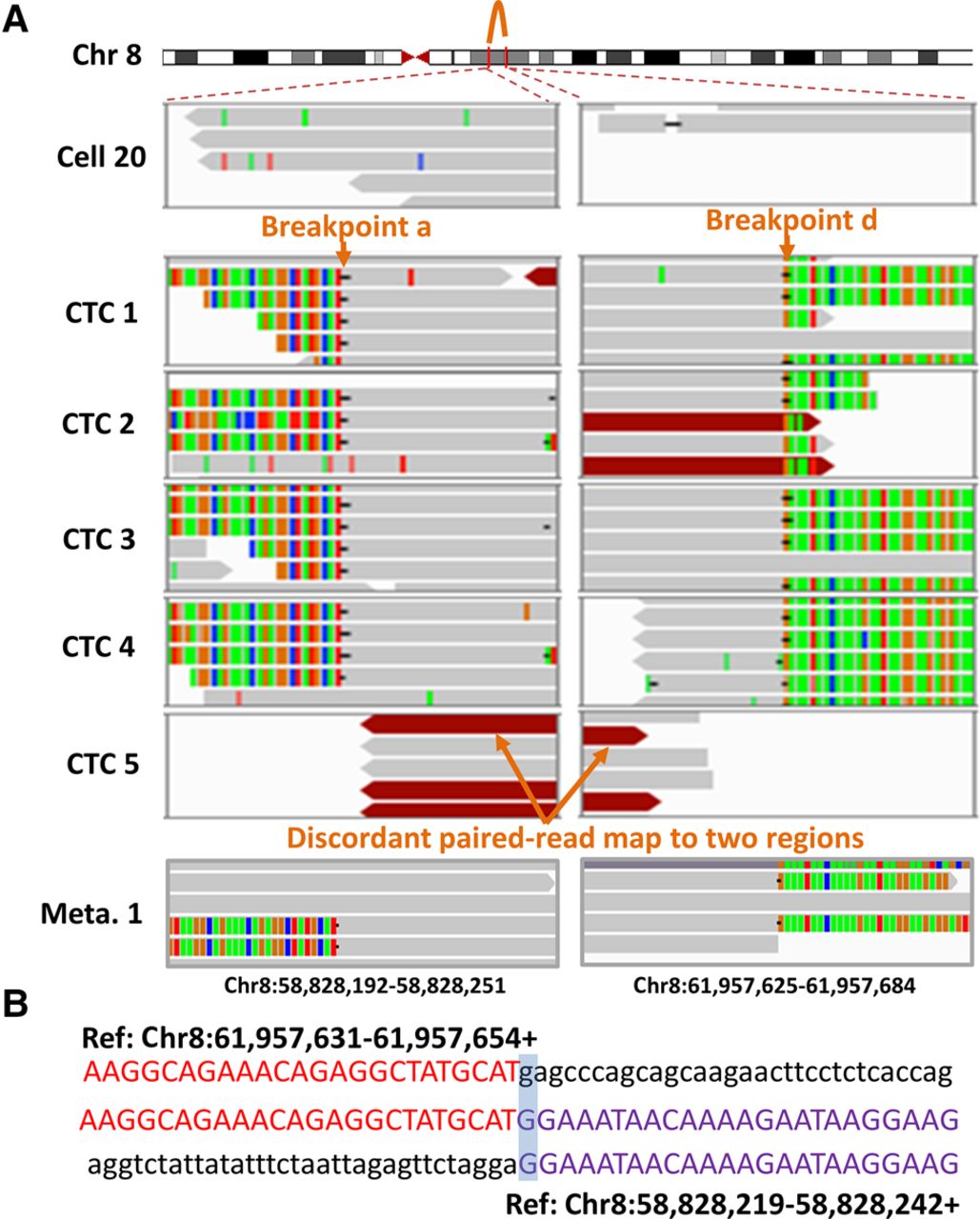 Identification of breakpoint sequences at the CNA boundaries. (A) Visualization of aligned reads around breakpoints a and d at the CNA boundaries in a primary tumor cell (Cell 20), five CTCs, and one of the lymph node metastases (Meta. 1) using an Integrative Genomics Viewer (IGV). Alignments are represented as gray, with color-coded base mismatches (A, green; T, red; G, orange; C, blue). Soft-clipped (colorful) bases around one breakpoint can be mapped to the reference genome around another joined breakpoint. Read pairs mapped to chromosome regions with much larger separations than the estimated insert size are indicated in dark red. (B) Sequences at the junction of breakpoints a and d. A representative sequence read (middle) was mapped to two regions (above and below) in the reference genome with appropriate orientation (+, forward strand).