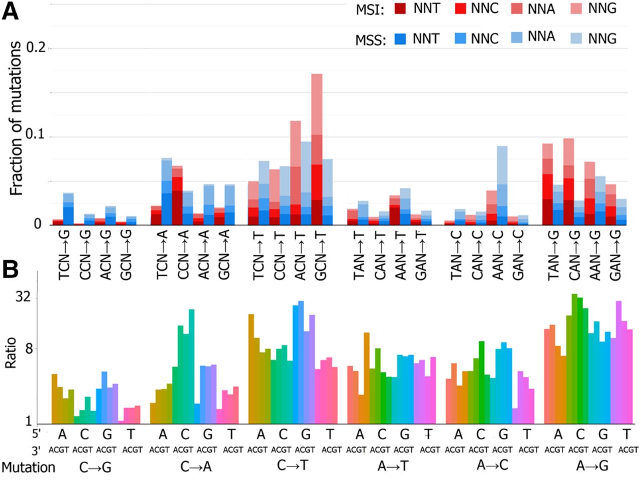 Comparison of mutational spectra of MMR-deficient and MMR-proficient cancers. Complementary mutation types were pooled. Data for MSI (n = 10) and MSS (n = 22) colon adenocarcinoma samples and uterine corpus endometrial carcinoma were pooled. Data for whole-genome sequencing. (A) Relative frequencies of the 96 mutation types (all possible mutation types in all possible tri-nucleotide contexts) in MSI and MSS cancers. (B) Ratio of the rates of each substitution in MSI and MSS cancers. Note the logarithmic vertical axis.