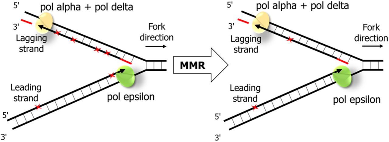 The schematic representation of MMR effectiveness during the leading and the lagging strand replication. While mismatches (red asterisks) are introduced more frequently during replication of the lagging strand by Pol delta, MMR corrects more mismatches on the lagging strand.