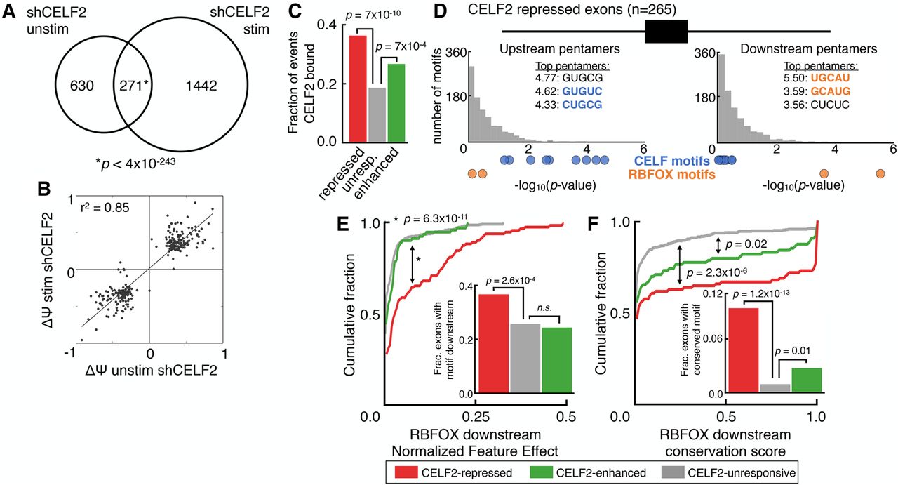 RNA-seq reveals global CELF2 regulation in T cells and sequence analysis suggests coregulation by the RBFOX family. (A) Venn diagram of the overlap of unique, high-confidence LSVs (Vaquero-Garcia et al. 2016) that showed significantly altered splicing (|ΔΨ| ≥ 20% with probability ≥95%) upon depletion of CELF2 by shRNA in unstimulated (left), stimulated (right), or both (middle) JSL1 Jurkat T cells (Fisher's exact (FE) test, two-tailed P < 7 × 10−192). (B) Scatterplot comparing E(ΔΨ) values for the most changing junction from the 271 unique, coregulated LSVs upon CELF2 depletion in unstimulated (X) and stimulated (Y) Jurkat T cells. (C) Fraction of high-confidence cassette exons derived from the union of events in panel A, containing splice site proximal CELF2 CLIP-seq peaks that were repressed by CELF2 (red, n = 265), enhanced by CELF2 (green, n = 371), or unresponsive (gray, n = 1668) (FE test, two-tailed). (D) Distribution of enrichment significance (−log10[P-value], hypergeometric test comparing regulated to unresponsive sets) for the occurrence of all pentamers upstream (left) or downstream (right) of CELF2-repressed exons. Top three pentamers for each are shown in the inset and motifs known to be bound by the CELF family or RBFOX family are highlighted in blue or orange, respectively. See Supplemental Table S2 for all values. (E) Cumulative distribution function (CDF) of the AVISPA predicted impact on splicing (normalized feature effect, NFE) (Barash et al. 2013) for downstream [U]GCAUG motifs for the subsets of events that contained it (Kolmogorov-Smirnov two-sample test). Fraction of each set with a downstream [U]GCAUG is given in inset with colors corresponding to the key (FE test, two-tailed). (F) CDF showing the average conservation (phastCons 46way, placental mammals) for the core GCAUG motif for the subsets of events that contained it downstream of the alternative exon (Kolmogorov-Smirnov [KS] two-sample test). Fraction of each set with a highly conserved downstream GCAUG (see Methods) is given in inset with colors corresponding to the key (FE test, two-tailed).