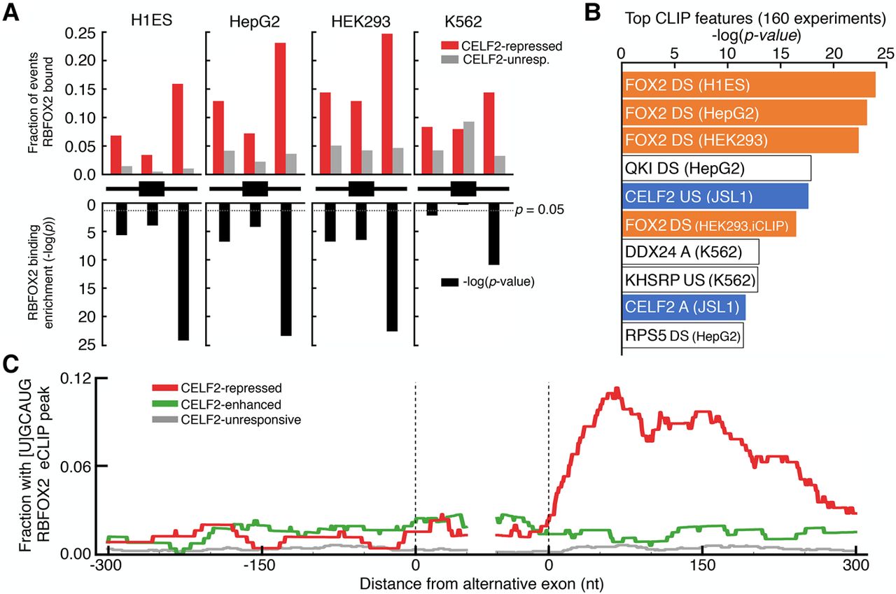 CELF2-repressed exons are highly enriched for downstream in vivo binding of RBFOX2. (A) Fraction of exons that were repressed by CELF2 (red) or unresponsive (gray) that contained an RBFOX2 eCLIP peak from indicated cell type in regions proximal to the alternative exon (black diagram: within 300 nt upstream, within the exon, or within 300 nt downstream) (top) and −log10(P-value) of enrichment of RBFOX2 eCLIP peak occurrence in the CELF2-repressed versus unresponsive set (bottom, black bars, Fisher's exact test, two-tailed P). (B) Top 10 enriched CLIP features found when comparing CLIP peak occurrence from 160 experiments (ENCODE eCLIP and iCLIP) (Ajith et al. 2016) between CELF2-repressed and unresponsive exons. Condition in which each CLIP experiment was carried out is indicated in parentheses. CLIP experiments for RBFOX2 or CELF2 are indicated in orange or blue, respectively. (DS) Bound downstream of alternative exon, (US) bound upstream of alternative exon, (A) bound within alternative exon. (C) RNA maps showing the per-nucleotide frequency of [U]GCAUG containing RBFOX2 eCLIP peak occurrences within 300 nt of alternative exons that are repressed by CELF2 (red), enhanced by CELF2 (green), or were unresponsive to depletion (gray).