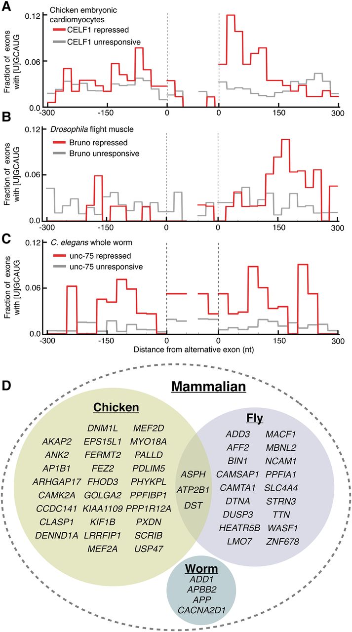 RBFOX motifs are enriched downstream of exons repressed by ancient CELF homologs. Histogram of the frequency of [U]GCAUG motifs in nonoverlapping 20-nt windows within 300 nt of alternative exons that are repressed by ancient CELF family homologs (red) or were unresponsive to depletion/mutation (gray) in (A) chicken embryonic cardiomyocytes (control versus siRNA knockdown of CELF1) (Blech-Hermoni and Ladd 2015), (B) Drosophila melanogaster indirect flight muscles (control versus RNAi hairpin knockdown of bru1) (Spletter et al. 2015), and (C) C. elegans whole worm (control versus unc-75 null [e950] mutants) (Norris et al. 2014). (D) Venn diagram showing mammalian gene names containing CELF/RBFOX coregulated splicing where the orthologous gene in chicken, fly, or worm also contains a putative CELF/RBFOX coregulated event (see Methods and Supplemental Table S7).