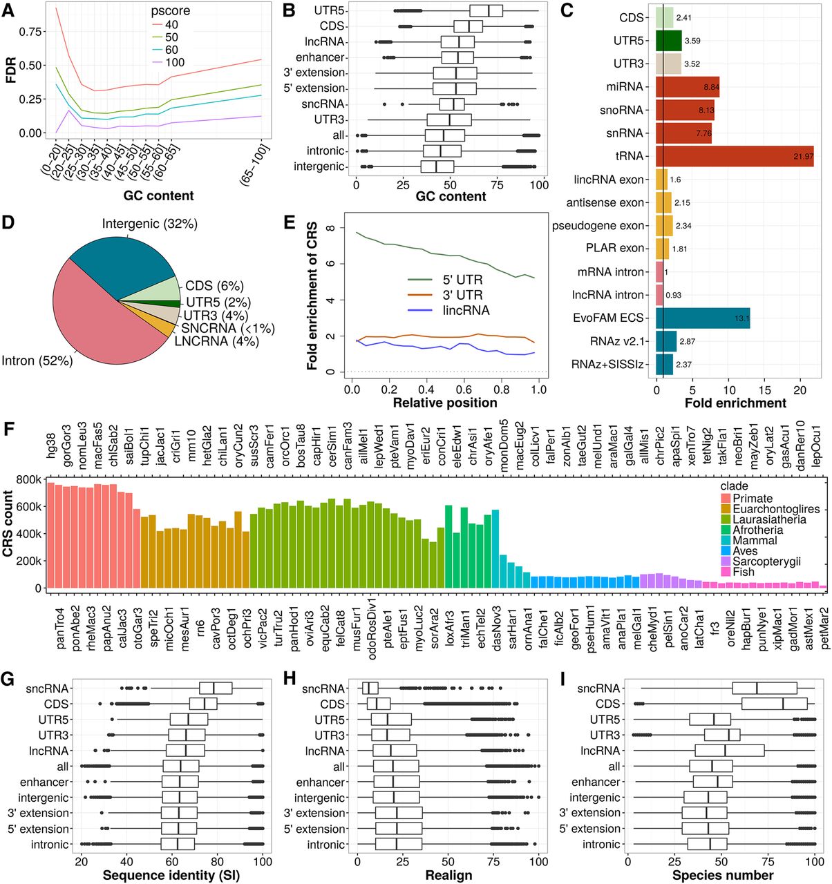 Performance assessment, genomic distribution, and conservation of CRS predictions. (A) Mean FDR of CRSs for different CMfinder score (pscore) cutoffs and GC-content intervals. FDR calculation is based on SISSIz (Gesell and Washietl 2008) simulated alignments. The large decrease in FDR observed between pscore cutoff 40 and 50 motivated us to base all further analyses on pscore ≥ 50. The mean FDR covering all ranges of GC content is 15.8. (B) GC content of CRS region alignments. (C) Fold enrichment of CRS regions for biotypes and previous computational RNA structure screens in vertebrates (blue). (D) Absolute CRS region coverage of biotypes. (E) Relative position of CRS regions over noncoding biotypes presented as fold enrichment of CRS regions in bins, each 5% (considering only exons) of the feature's (UTR or gene) length. The trend of decreasing number of structures from 5′ to 3′ is common to 5′ UTRs and lncRNAs. (F) Number of CRSs conserved in the 100-species tree. (G) Average pairwise sequence identity (SI) of CRS region alignments over the 17 representative genomes in the phylogenetic tree. (H) Realignment (calculated as in Torarinsson et al. 2008) compares the 17-species MULTIZ alignment blocks (hg18) to corresponding structure-based alignments of CRS regions (17-way subalignments extracted from our 100-species/hg38 results, as described in Methods). (I) Species number of CRS region alignments. In B,G, and I, the CRSs of highest GC content, SI and species number, respectively, are used as representatives of a CRS region, and in H the CRSs of lowest realignment are used as representatives. The biotypes in G, H, and I are sorted by their median SI.