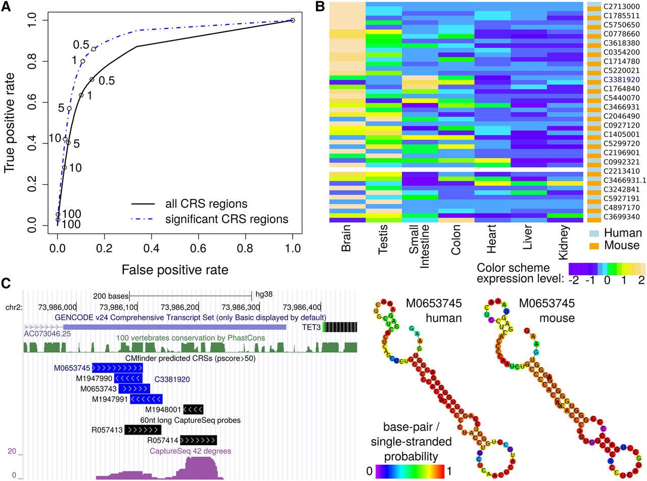 CaptureSeq and qRT-PCR show conserved expression of CRSs. (A) ROC curve of CRS region detection in brain based on public poly(A) RNA-seq defined by different CPM/RLE cutoffs (numbers on the curves) using the CRS region detection through CaptureSeq in fetal brain as the gold standard. (B) Expression profiles of 23 CRS regions were measured with qRT-PCR (normalized by CRS regions) in seven tissues in both human and mouse. The CRS regions have weakly conserved primary sequences and were expressed in the CaptureSeq (P < 0.1). The CRS regions are sorted by decreasing Pearson's correlation coefficients of expression profiles between human and mouse. (C) The CRS region C3381920 is located in the 3′ end of the lncRNA AC07304.25. Despite no expression in brain in publicly available total and poly(A) RNA-seq data, it showed up in human brain in both CaptureSeq and qRT-PCR. Common expression in human and mouse was observed in the gastrointestinal tract (small intestine and colon; see B). Region C3381920 contains the CRS M0653745 whose structure is highly conserved between human and mouse. Color code in human and mouse structures is base-pair probabilities calculated by the Vienna RNA package (Lorenz et al. 2011).