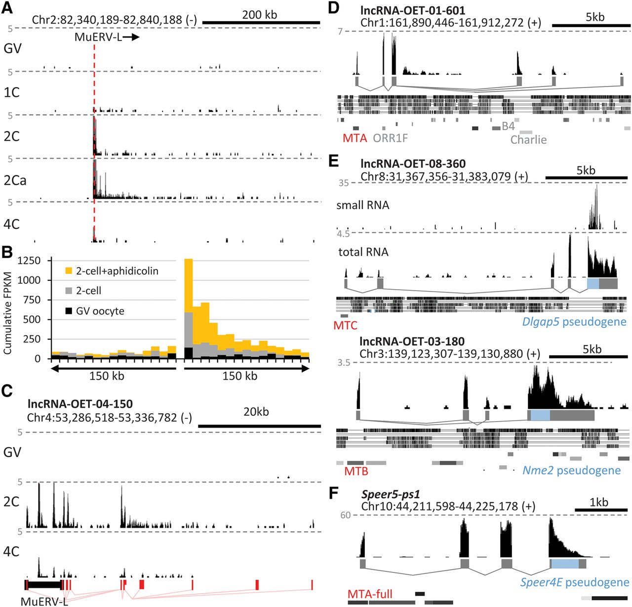 Genome scanning by LTRs and emergence of new genes. (A) Transcription downstream from MuERV-L is apparent during ZGA, especially in two-cell embryos treated with aphidicolin (2Ca). Shown is a representative UCSC Genome Browser snapshot of an MuERV-L insertion expressed during ZGA. The gray horizontal lines represent five CPM. Stages: (GV) full-grown GV oocyte; (1C) one-cell (fertilized egg); (2C) two-cell; (4C) four-cell. (B) Cumulative display of transcription in 150-kb genomic flanks around the hundred MuERV-L elements most expressed during ZGA. (C–F) UCSC Genome Browser snapshots of selected genomic loci with mapped NGS data (Abe et al. 2015; Karlic et al. 2017). Gray dashed lines indicate CPMs. Positions of repetitive sequences (D–F) are indicated by gray rectangles in rows from the top: SINE, LINE, LTR, and DNA transposon elements. The conservation tracks (D,F) display homology with rat (top), rabbit, human, dog, and cow genomes. (C) A lncRNA gene with MuERV-L-derived 5′ exons and downstream exons from the genomic flank. (D) A new lncRNA gene formed by MaLR LTR insertions. The promoter and exon 1 come from an MTA solo LTR, exon 2 through exonization of an ORR1F solo LTR. (E) Examples of antisense pseudogene sequence rewiring yielding a lncRNA substrate for endosiRNAs where an MTB solo LTR was inserted into a locus already containing a pseudogene (Nme3) or a pseudogene (Dlgap5) was inserted into a locus already containing an MTA. (F) An example of a sense pseudogene (Speer4E pseudogene) rewiring yielding a CPAT positive transcript.