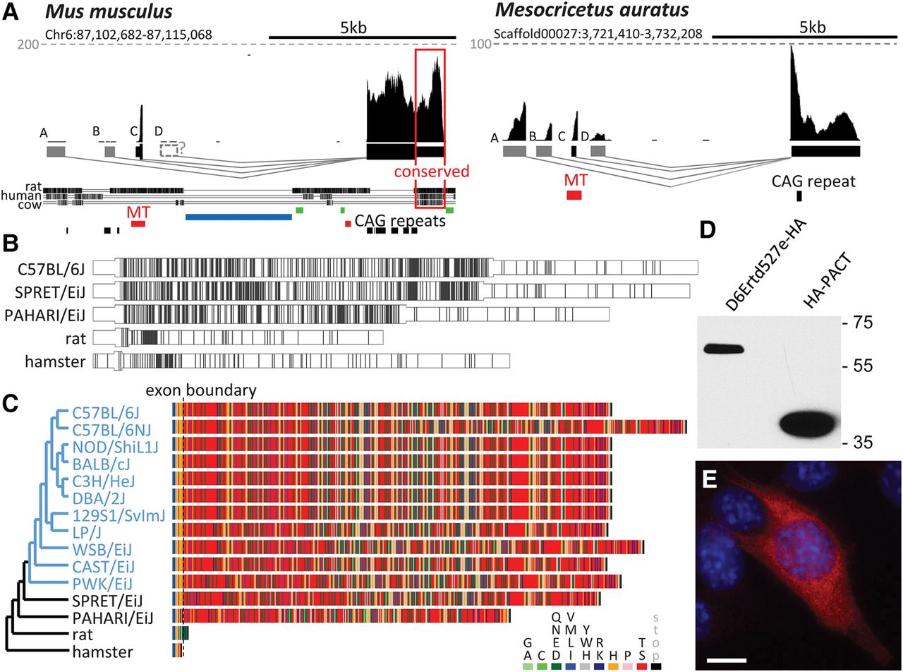 A solo MTD LTR contribution to de novo evolution of a protein-coding gene. (A) Genomic organization of the D6Ertd527e locus in Mus musculus and Mesocricetus auratus. Shown are UCSC Genome Browser snapshots of D6Ertd527e loci with mapped oocyte RNA NGS. The gray dashed lines indicate CPMs. Below the conservation track is the RepeatMasker track with MT LTR insertions in red, SINE insertions in green, and a large LINE-1 insert in blue. The conserved 3′ UTR region is framed. (B) CAG trinucleotide density in MTD-driven transcripts in mice, rat, and hamster. Each CAG is represented by a vertical line. The widening depicts the coding sequence; the initiation codon is in the MTD exon. (C) Virtual translation of MTD-driven D6Ertd527e transcripts from rodent species (black) and mouse strains (blue). The phylogenetic tree was adopted from Nellaker et al. (2012). (D) D6ERTD527E protein expression in NIH3T3 cells. Transiently transfected cells expressing C-terminally HA-tagged D6ERTD527E or N-terminally HA-tagged PACT (control) were analyzed 48 h post-transfection by immunoblotting. (E) Ectopically expressed C-terminally HA-tagged D6ERTD527E protein (red) has cytoplasmic localization in mouse NIH3T3 cells. DNA (blue) was stained with DAPI. Untransfected cells lacking the HA signal demonstrate staining specificity. Scale bar, 10 μm.