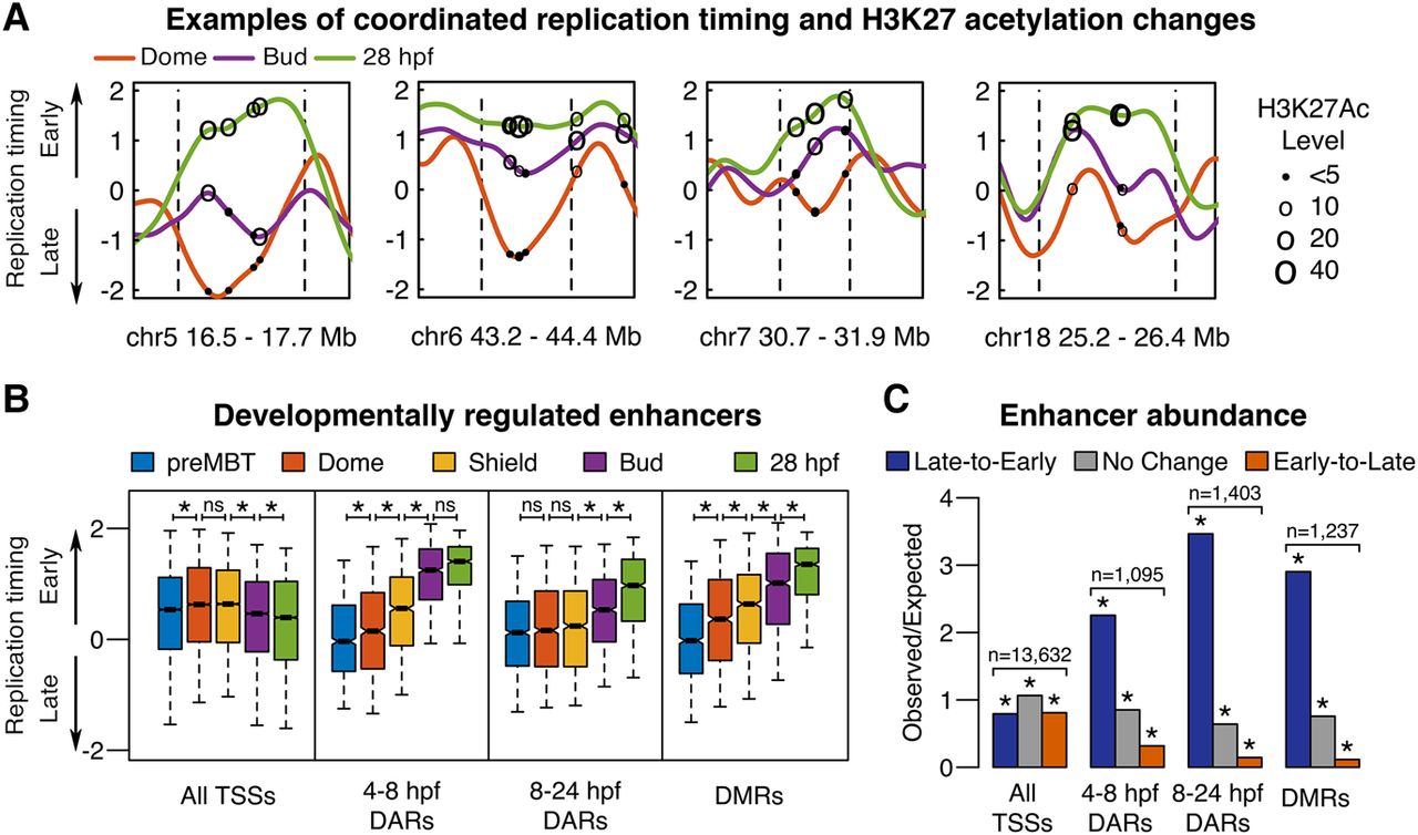 Enhancer activation parallels late-to-early replication timing changes during development. (A) Replication timing plots at Dome (4.3 hpf; orange), Bud (10 hpf; purple), and 28 hpf (green), with dashed lines indicating genomic region subject to developmental change. Circles mark the genomic positions of differentially acetylated regions (DARs) and have diameters proportionate to the acetylation levels at similar developmental stages (4.3 hpf, 8 hpf, and 24 hpf, respectively) (Bogdanović et al. 2012). (B) Replication timing at each developmental stage for the transcription start sites (TSSs), DARs that become acetylated between 4.3 and 8 hpf or 8 and 24 hpf, and differentially methylated regions (DMRs) that become demethylated between 6 and 24 hpf: (*) paired t-test with Bonferroni corrected P < 0.0001 (Bogdanović et al. 2012; Lee et al. 2015). Box plots show the median (line), 95% confidence interval (notch), 25th–75th percentile (box), and 10th–90th percentile (whiskers). (C) Observed/expected counts of TSSs, DARs, or DMRs in all genomic regions classified by hidden Markov model (HMM) segmentation as either undergoing developmental replication timing changes from late-to-early, early-to-late, or no change: (*) binomial test with Bonferroni corrected P-value <5 × 10−12.