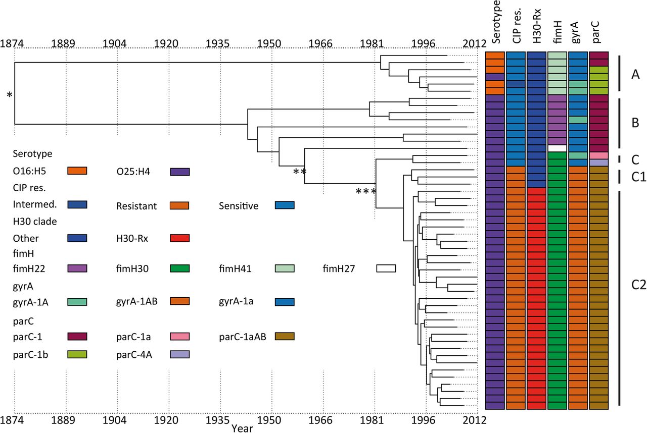 Temporal analysis on ST131 using BEAST. Figure shows the serotype, resistance to ciprofloxacin (CIP res.), assignment to clade C2 (H30-Rx), and the gene alleles of fimH, gyrA, and parC. (*) MRCA; (**) emergence of clade C; (***) emergence of CIP-resistant clade C1.