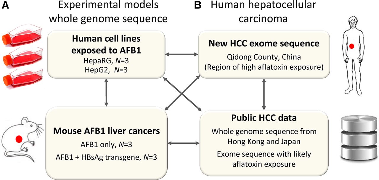 Study design. (A) We experimentally elucidated the mutational signature of AFB1 based on whole-genome sequence in four experimental systems: two different AFB1-exposed human cell lines and liver tumors in AFB1-exposed wild-type mice and in AFB1-exposed mice that carried a hepatitis B surface antigen transgene. In total, we examined 48,000 mutations in experimental systems including mutations in cell lines and somatic mutations in mouse tumors. (B) We integrated these experimental results with newly generated genomic HCC data from a geographical region of known aflatoxin exposure and with additional, publicly available human HCC data.