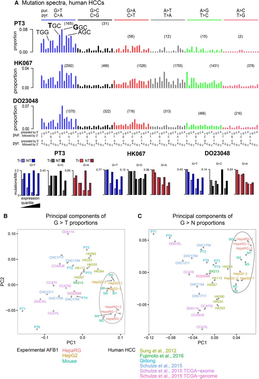 (A) Somatic mutation spectra and transcriptional-strand bias for initial study of aflatoxin signatures in example human HCCs with likely aflatoxin exposure. Transcribed strand (Tr); nontranscribed strand (NT). Principal component analysis of (B) G > T and (C) G > N mutations for AFB1 experimental data (enclosed in irregular ovals) and HCCs with likely high aflatoxin exposure.