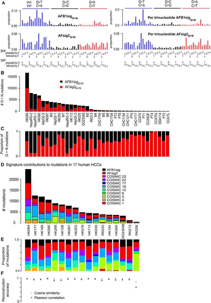 Aflatoxin signatures in human HCCs. (A) NMF decomposes the G > N spectra from experimental AFB1 exposure and likely aflatoxin-associated HCCs into two components, denoted AFB1sigG>N and AFsig2G>N. The left-hand side of the panel shows the signatures, as is conventional, based on trinucleotide frequencies in the human genome; the right-hand side shows them in frequencies per trinucleotide—equivalent to assuming all trinucleotides are equally common. (B,C) AFB1sigG>N (black) almost completely captures the spectra of HepaRG cell lines; AFsig2G>N (red) almost completely captures the spectra of some HCCs (e.g., HK067, HK203), while the mutations in HepG2, the mouse tumors, and some HCCs are most accurately reconstructed by a mixture of AFB1sigG>N and AFsig2G>N. (D,E) Nonnegative matrix factorization of selected HCCs using mutational signatures known to occur in HCCs, plus extensions of AFB1sigG>N and AFsig2G>N with A > N proportions set to 0, the latter denoted AFB1sig and AFsig2. (D) Absolute mutation numbers assigned to each signature. (E) Proportions of mutations assigned to each signature. (F) Reconstruction accuracy is generally good, with the exception of RK206, which has few mutations and a hard-to-reconstruct mutation spectrum outside of G > T mutations, partly due to spikes at TCA:TGA > TTA:TAA and CTG:CAG > CCG:CGG.