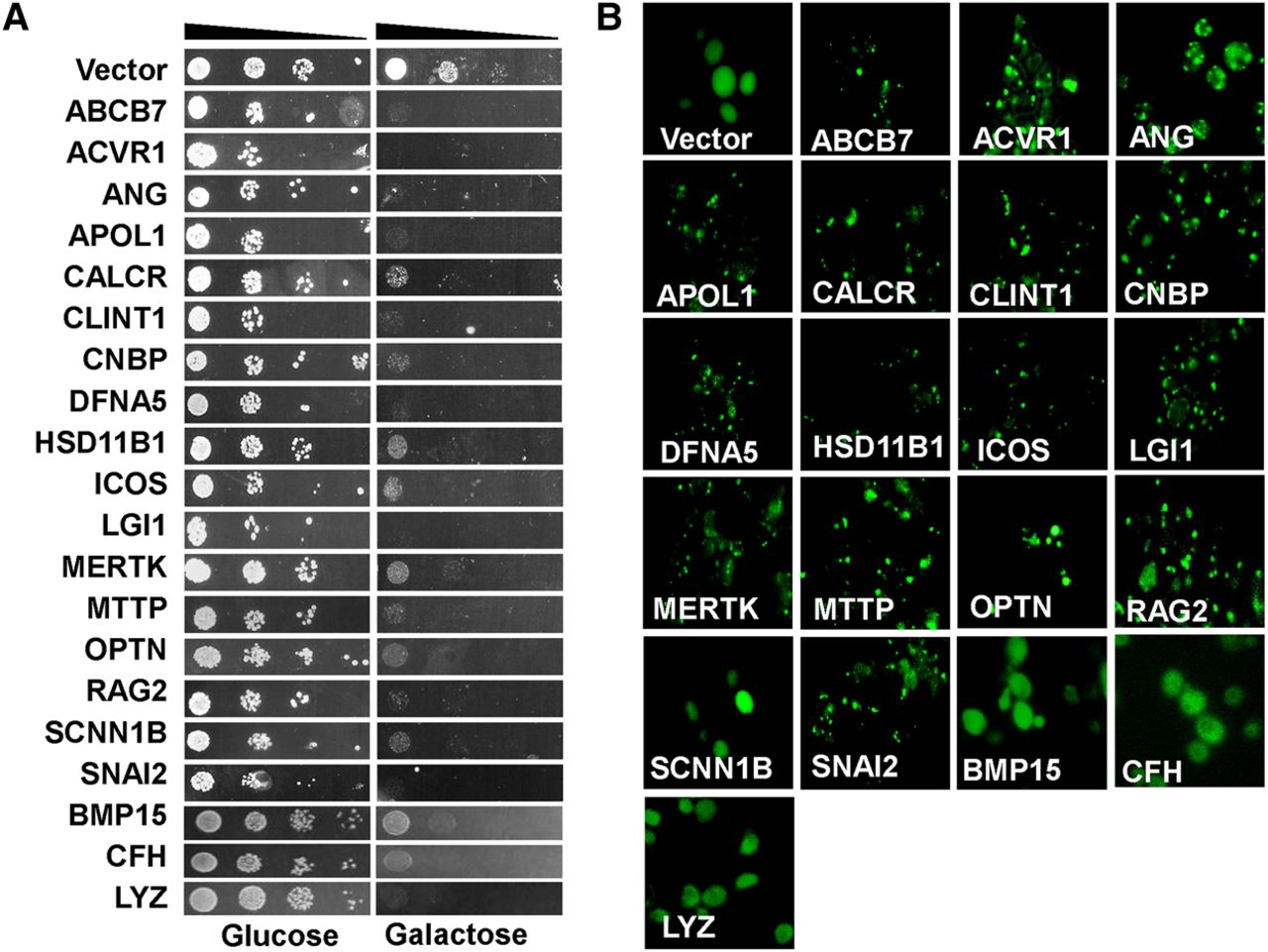 Overexpression of selected OMIM genes induces toxicity and cytoplasmic aggregates in yeast. (A) In total, 1305 OMIM ORFs were cloned under the control of a galactose-inducible promoter in pAG425 vectors. pAG425Gal-OMIMs were individually transformed into yeast. Transformants were grown in SRaf-Leu medium for 16 h, spotted onto SD-Leu agar plates (OMIM expression “off”) or SGal-Leu agar plates (OMIM expression “on”), and incubated for 3 d. Shown are 10-fold serial dilutions starting with an equal number of cells expressing the 20 toxic OMIM genes. Nontoxic OMIM genes are not shown. (B) Yeast cells expressing the “C-terminal GFP-tagged OMIM” fusion proteins were visualized with fluorescence microscopy. GFP alone was distributed in the cytoplasm. Most of the toxic GFP-tagged OMIM proteins formed protein aggregates.