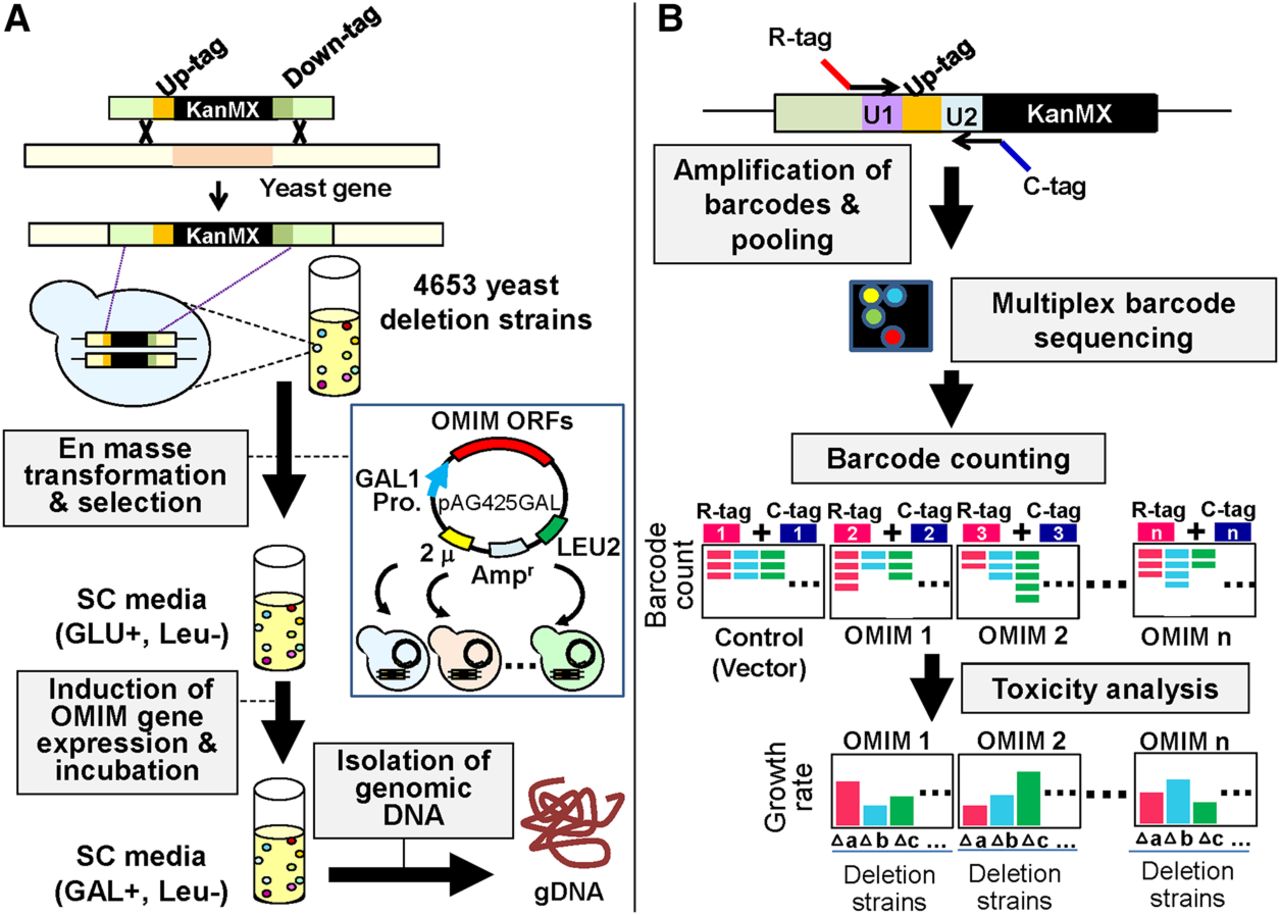 Flowchart describing the yeast genetic interaction screen. (A) The 20 toxic OMIM genes were transformed individually into a pool of 4653 yeast homozygous deletion strains containing a 20-bp DNA barcode sequence. Transformants were selected in SD-Leu medium for 16 h and then washed twice with PBS. The cells were resuspended in SGal-Leu medium and incubated for 2 d to induce the expression of OMIM genes under the control of the GAL1 promoter. Genomic DNA was separately isolated from cells harvested at the end of pooled culture in the presence of GLU or GAL. (B) Barcodes were amplified from genomic DNA with multiplexed primers containing distinct combinations of two different tags for each OMIM gene. Equal amounts of DNA amplified for each OMIM gene were pooled and subjected to multiplex barcode sequencing using an Illumina Genome Analyzer. Next-generation sequencing data were then analyzed for barcode counting.