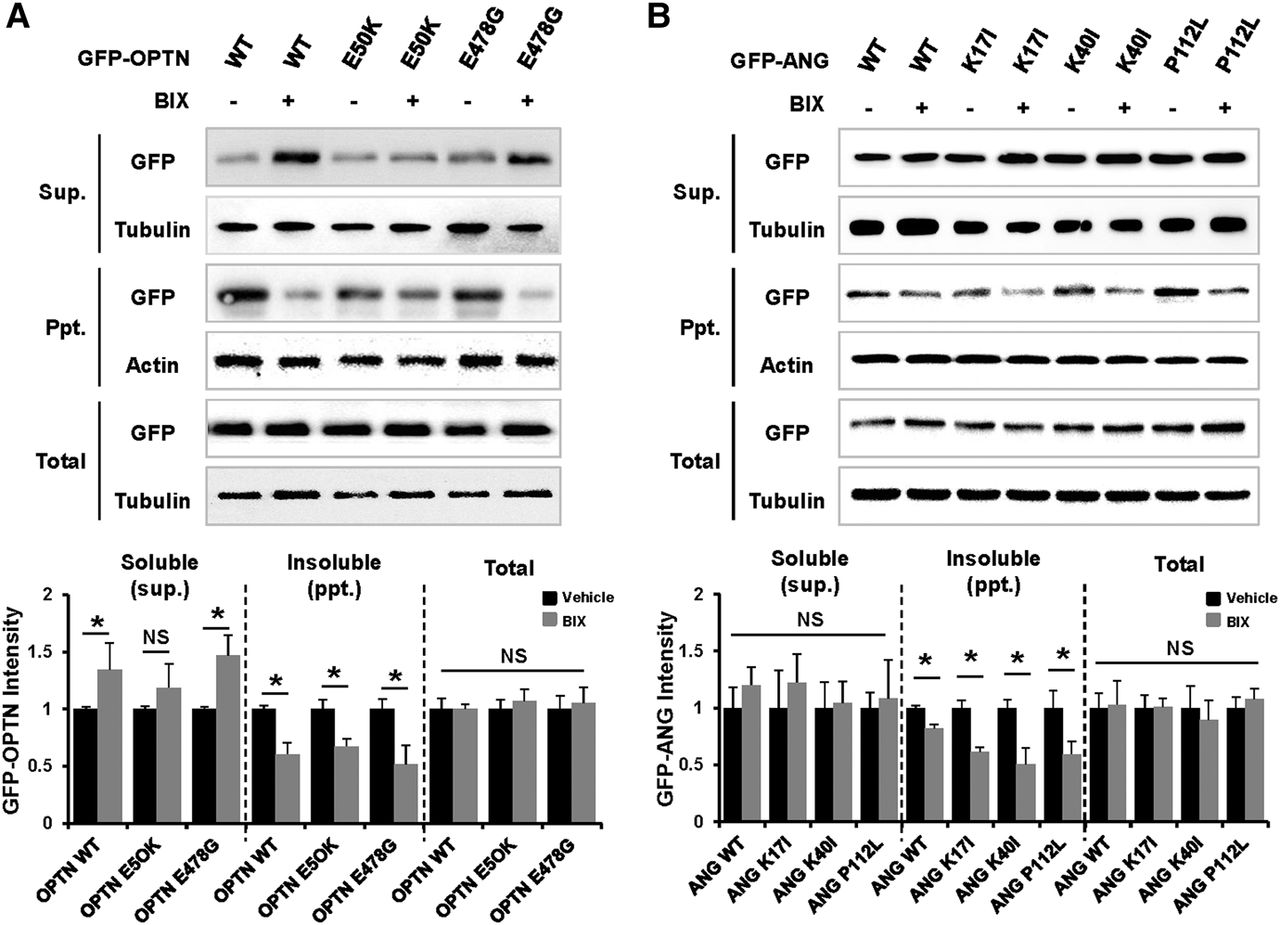 MAP2K5 inhibition attenuates the formation of OPTN and ANG protein aggregates in mammalian cells. NIH3T3 cells were transiently transfected with wild-type GFP-OPTN or GFP-OPTN mutants (E50K or E478G) (A) and wild-type GFP-ANG or GFP-ANG mutants (K17I, K40I, or P112L) (B). At 36 h after transfection, cells were incubated with vehicle or 10 µM BIX 02189 (MAP2K5 inhibitor) for 12 h. Cells were lysed in NP40 lysis buffer, and the lysates were separated into soluble and insoluble fractions: (Sup.) supernatant; (Ppt.) precipitate. OPTN or ANG proteins in the cellular fractions were detected with Western blot analysis using an antibody against GFP. DMSO (0.1% v/v) was used as a vehicle. The densitometry analysis was plotted as an intensity ratio of soluble GFP-OPTN/tubulin (Sup.), insoluble GFP-OPTN/actin (Ppt.), and total GFP-OPTN/tubulin (Total). The densitometry analysis for GFP-ANG was done in the same manner. The results of the densitometric analysis (bottom) are presented as the mean ± SD (n = 3); (*) P < 0.05 versus vehicle.