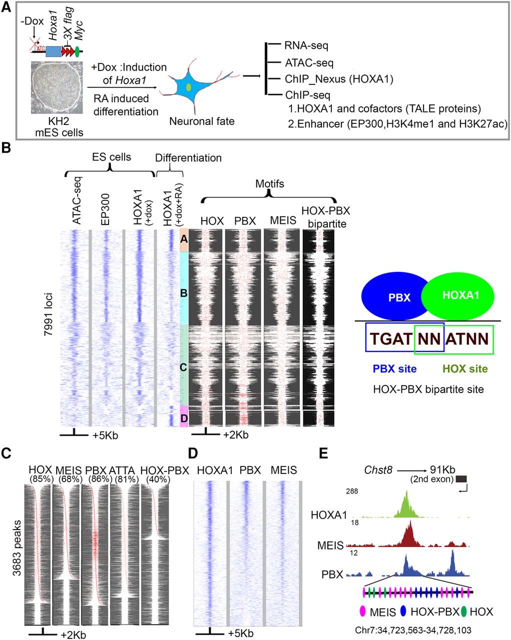 Genome-wide identification and analysis of HOXA1-bound regions reveal overlaps with PBX and MEIS binding. (A) Experimental design for differentiation and analysis where Dox (+Dox) induces epitope-tagged Hoxa1 and retinoic acid (+RA) induces programmed differentiation of ES cells into neural fates. (B) Heat maps of genome-wide occupancy of HOXA1 in ES cells (+dox) and differentiated cells (+dox +RA) defined by ChIP-seq. The occupancy of EP300 and chromatin state (ATAC-seq) in ES cells is also shown. Analyses of ES and differentiated cells reveal four distinct groups (A–D) of bound regions. The four columns on the right show the spatial distribution of consensus motifs for HOX, PBX, MEIS, and HOX-PBX bipartite binding sites in the corresponding genomic regions. Best FIMO matches (P ≤ 1 × 10−4) for all variants of the HOX, PBX, and MEIS, and HOX-PBX bipartite motifs are highlighted in red. A diagram illustrates the relationship of PBX and HOX binding sites in HOX-PBX bipartite motifs (far right panel). Groups A and D, representing HOXA1-bound regions in differentiated cells, show increased presence of HOX-PBX bipartite sites and tandem clusters of PBX motifs. (C) HOXA1-bound regions in differentiated cells are enriched for consensus HOX, PBX, and MEIS motifs. For each TransFac motif, FIMO matches (P ≤ 1 × 10−4) are shown in red. The respective motif and % of peaks with the motif are indicated (top of each column). Each row is independently sorted by the distance of the central-most motif to the peak center. Many rows of HOXA1-bound regions show multiple binding motifs in a peak (red dots). (D) Heat map shows extensive co-occupancy of HOX, PBX, and MEIS on HOXA1 targets in differentiated cells. The plots use IP coverage of z-score matrix for PBX and MEIS binding at HOXA1 peaks. Rows are sorted by the intensity of the PBX signal within the central 1-kb region. In B–D, the size of regions flanking the center of the peak of HOXA1 binding are shown at the bottom. (E) UCSC Genome Browser shots showing PBX, MEIS, and HOXA1 in exon 2 of Chst8. Clustering of multiple HOX, HOX-PBX, and MEIS binding sites are also shown at the bottom for the HOXA1-bound region.