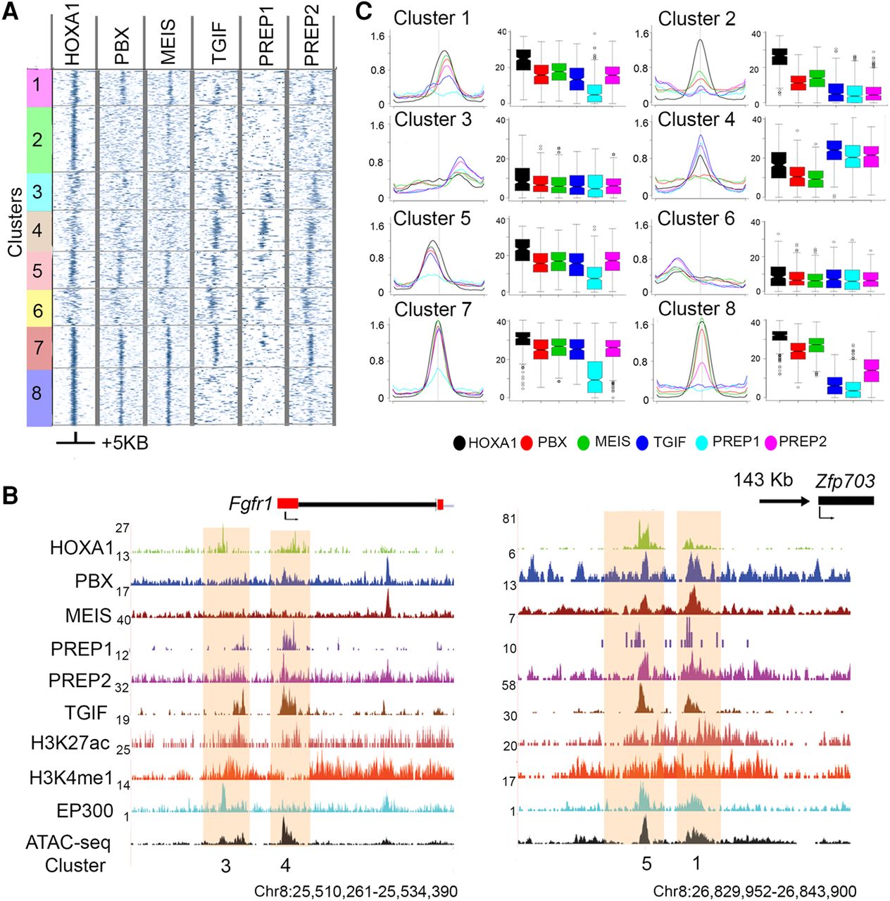 Patterns of co-occupancy of TALE proteins on HOXA1 targets define eight distinct clusters. (A) Heat maps for occupancy of individual TALE factors at HOXA1 peaks using IP coverage of z-score matrix after k-means-clustering (k = 8). Only positions of positive z-score are shown. A ±5-kb region flanking the center of the peaks of HOXA1 binding is shown. (B) Average binding levels, shown as line and box plots, illustrate the distinct properties with respect to relative binding of each protein and its spatial distribution of each cluster in A. Box plots are row sums from the central 1 kb of each column. (C) UCSC Genome Browser shots (coordinates from version mm10) of Fgfr1 and Zfp703 loci, showing HOXA1-bound regions along with occupancy of TALE cofactors, activator protein EP300, enhancer marks, and chromatin state. The clusters to which these bound regions map are noted at the bottom.
