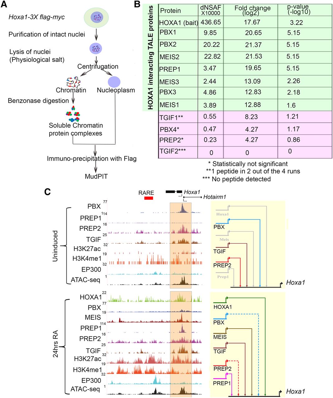 Interactions between HOXA1 and TALE proteins on chromatin and binding of TALE proteins to the Hoxa1 locus. (A) Strategy for isolation and identification of chromatin-bound complexes interacting with HOXA1 by immunoprecipitation and MudPIT. (B) MudPIT analyses averaged from four replicates showing dNSAF(X10000), fold enrichment, and P-values of TALE proteins associated with HOXA1 on chromatin. (C) UCSC Genome Browser shots (mm10) for the Hoxa1 locus. Binding of HOXA1 and occupancy of the TALE family members, modified histone marks (H3K4me1 and H3K27Ac) characteristic of enhancers, occupancy of the EP300 activator protein, and accessibility of chromatin (ATAC-seq) are shown in uninduced (top) and differentiated (bottom) cells. The orange shaded area indicates Hoxa1-bound regions near the promoter. In the BioTapestry plots (right panels), solid colored lines indicate binding of each specific TALE factor, while gray lines indicate lack of binding. Dotted lines represent decreased binding.