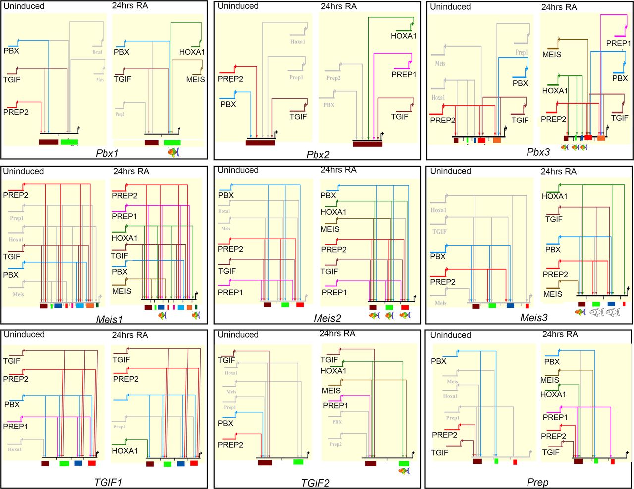 BioTapestry models depicting the auto- and cross-regulatory interactions between HOXA1 and TALE members. ES cells are depicted on the left and differentiated cells on the right. Solid colored lines indicate binding of each specific TALE factor or HOXA1, gray lines indicate lack of binding, and dotted lines represent decreased binding. At the bottom, the colored boxes indicate each TALE locus and the respective cis-regulatory regions that integrate the specific binding inputs. Colored cartoon fish under cis-regulatory elements indicate those with spatially-restricted regulatory activity, while the uncolored fish indicate a lack of reporter activity.