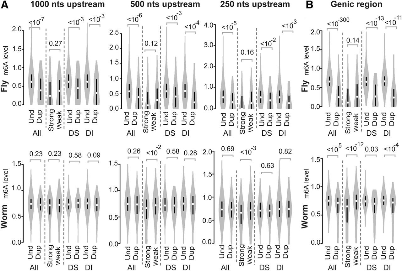 Violin plots of the adenine DNA methylation levels (m6A) detected in the following: (A) the promoter regions (1000, 500, and 250 nt upstream of the TSS) and (B) gene bodies (from the TSS to the TTS) of D. melanogaster (fly; top) and C. elegans (worm; bottom). P-values were determined with the Mann-Whitney U test and are associated with arched gray lines at the top of each panel that indicate the values that were compared. (Und) unduplicated; (Dup) duplicated; (Strong) strongly expressed; (Weak) weakly expressed; (DS) ortholog sets containing dosage-sensitive genes; (DI) ortholog sets containing only dosage-insensitive genes.