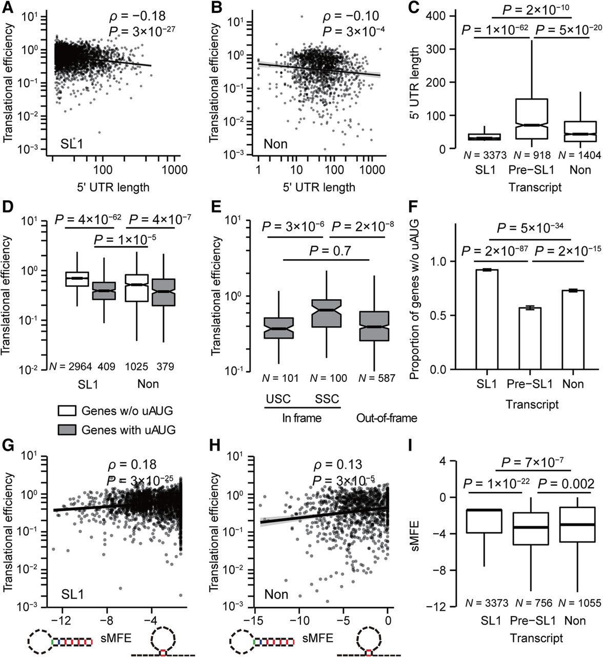 SL1 trans-splicing removes the uAUG and attenuates secondary structures in the 5′ UTR to enhance translational efficiency. The 5′ UTR length is negatively correlated with translational efficiency in both (A) SL1 trans-spliced genes (N = 3373) and (B) non-trans-spliced genes (N = 1404). Linear regression lines and their 95% confidence intervals are shown. (C) Before trans-splicing, the 5′ UTRs of SL1 trans-spliced genes (pre-SL1) are longer than those of non-trans-spliced genes (Non), whereas after trans-splicing, they (SL1) are shorter than those of non-trans-spliced genes. P-values were given by the Mann-Whitney U test. (D) Genes without an uAUG exhibit higher translational efficiencies among both SL1 trans-spliced and non-trans-spliced genes. P-values were given by the Mann-Whitney U test. (E) The translational efficiencies of genes with at least one in-frame uORF that terminates at an upstream stop codon (USC) are significantly lower than those with in-frame uORFs that share the stop codons (SSC) with the annotated ORFs (P-value was given by the Mann-Whitney U test). In addition, genes with an in-frame uAUG exhibit higher translational efficiencies than those with an out-of-frame uAUG (P = 7 × 10−5, Mann-Whitney U test). (F) The proportion of genes without an uAUG in non-trans-spliced genes is larger than that in pre-SL1 transcripts but is smaller than that in SL1 transcripts (Fisher's exact test). Error bars represent standard errors estimated from a binomial distribution. (G,H) The smallest MFE (sMFE) was used to estimate the free energy (in units of kcal/mol) of the most stable secondary structure in the 5′ UTR. The sMFE is positively correlated with translational efficiency in both (G) SL1 trans-spliced genes (N = 3373) and (H) non-trans-spliced genes (N = 1055). Schematic secondary structures are shown on the x-axis. (I) The sMFE in non-trans-spliced genes is slightly higher than that in pre-SL1 transcripts but is much smaller than that in SL1 transcripts. P-values were given by the Mann-Whitney U test.