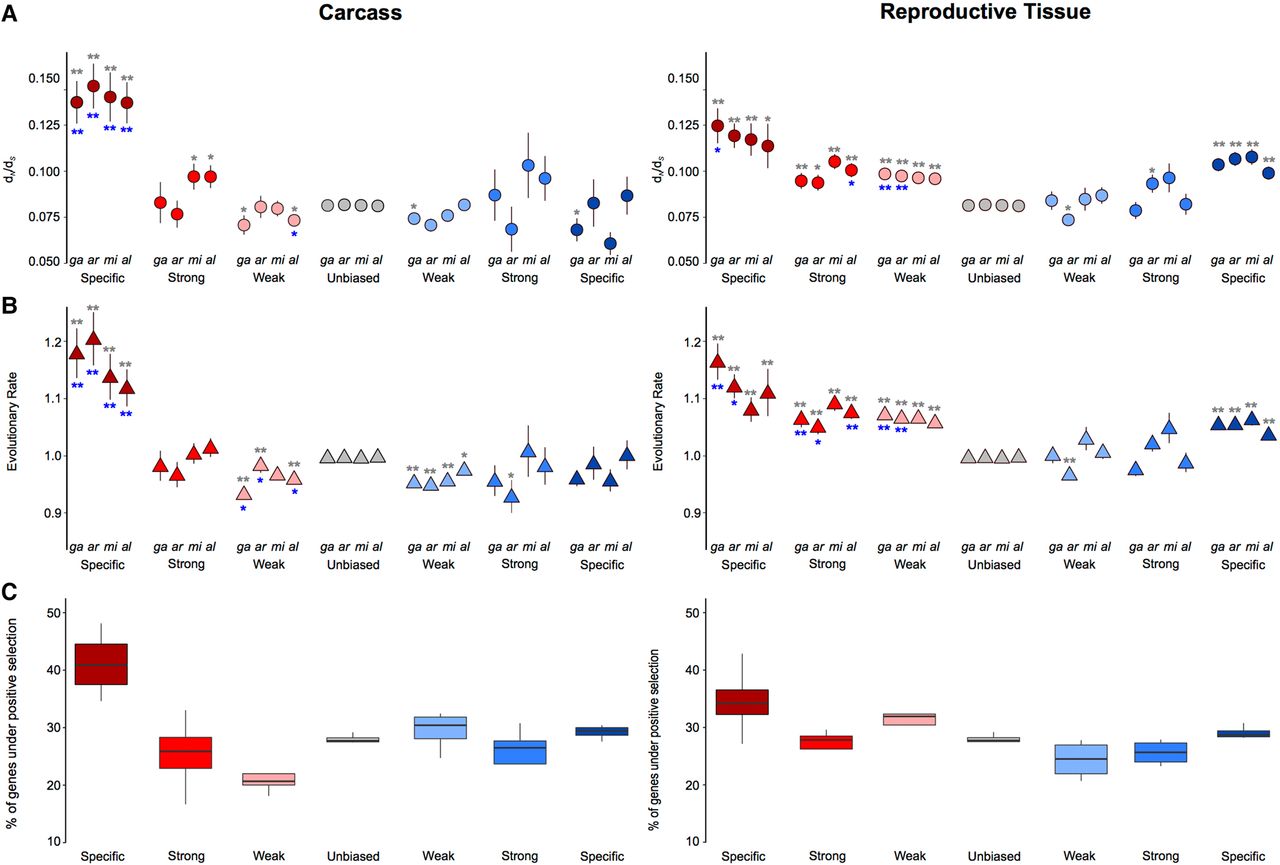 Sequence divergence rates of the four-species orthologs and selection tests. Average DNA sequence (A) and protein sequence (B) divergence levels of the four-species orthologs from each species plotted by the sex-bias expression classification. Wilcoxon rank-sum tests are used to test for significant differences when comparing divergence levels between the sexes (blue asterisks) or between sex-biased categories and unbiased genes (gray asterisks) and indicates: (*) P-value < 0.05, (**) P-value < 0.001. (C) Cross-species average of percentage of genes showing significant positive selection among the four-species orthologs for each sex-biased classification, in the carcass and in the reproductive tissues.