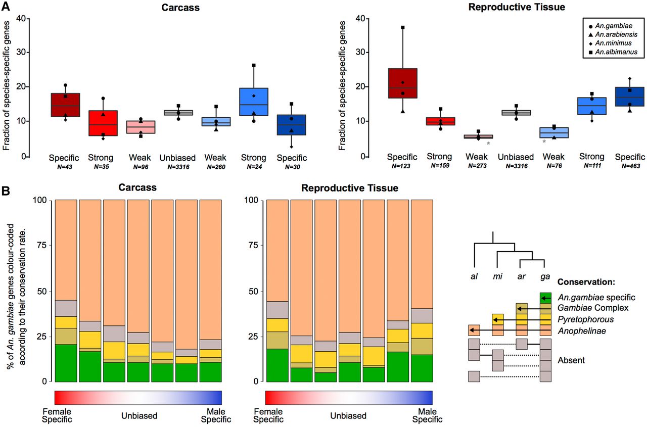 Sex-biased gene turnover rates. (A) The fraction of species-specific (orphan) genes is plotted for each sex-biased classification for the carcass and reproductive tissues, either for each species individually (points) or all species (box plot). A Wilcoxon rank-sum test of significance was used comparing sex-biased gene expression to unbiased genes; (*) P-value < 0.05. (B) Conservation of An. gambiae sex-biased genes across the phylogeny.