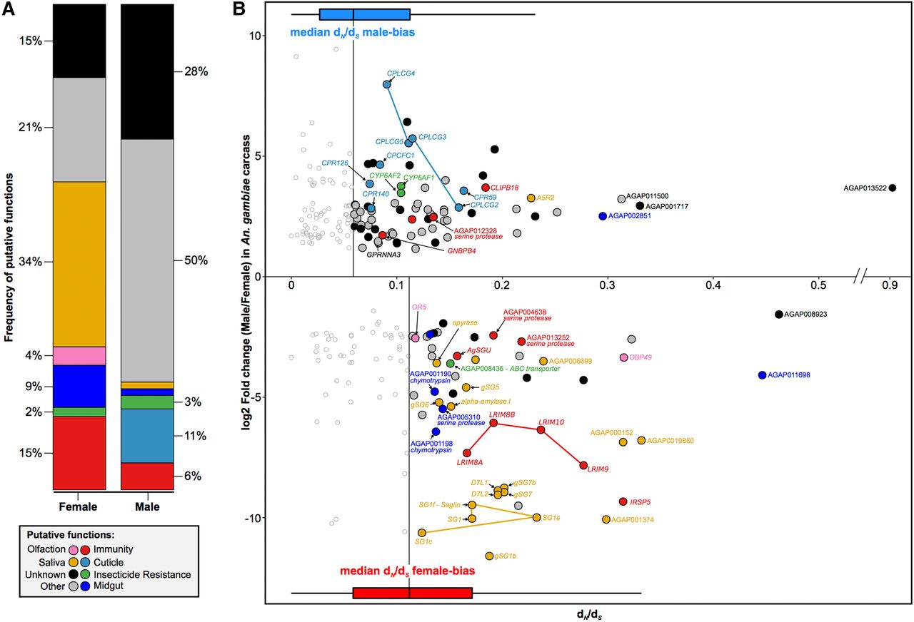 Functional analysis of rapidly evolving and highly sex-biased genes from the carcass of An. gambiae. (A) Relative proportions of putative functions among rapidly evolving sex-biased genes (sex-specific and strongly biased) in the carcass of An. gambiae. (B) Sex-biased expression ratios (in log2 fold change male/female) over sequence divergence rates (in dN/dS) for genes displaying strong bias or sex-specific expression in the carcass of An. gambiae. Horizontal box plots indicate dN/dS values for female- (red) and male-biased (blue) genes, highlighting the median values of each sex, which were used as a cutoff for downstream analysis. Genes with dN/dS value greater than the median of each sex are highlighted with putative functions using Gene Ontology (GO), orthology-based predictions, and community annotations (colored circles). Empty circles indicate genes evolving below our threshold of sequence divergence.