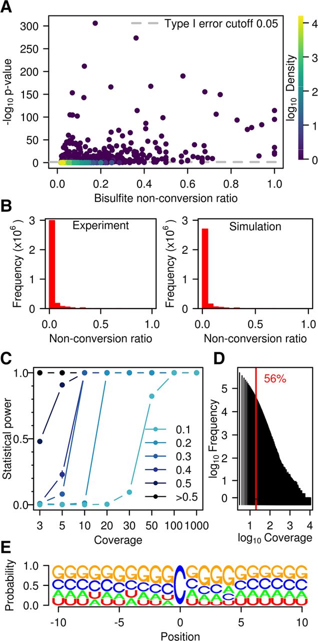 Statistical analysis of WTBS data sets. (A) Bisulfite nonconversion ratio (x-axis) and −log of methylation P-values (y-axis) for 56,940 cytosines with ratio >λp/coverage that are common to the three wild-type replicates. Color indicates density (count of points per symbol area). (B) Number of cytosines and nonconversion ratios, as determined experimentally (left) or by simulation (right). (C) Statistical power stratified by coverage and by nonconversion ratio. (D) Histogram of coverage in a representative (Wt1L) sequencing data set. The red line indicates a coverage of 20×. (E) Logo plot for all cytosines with a ratio >0.1 and significant P-value (<0.05) in at least one sample.