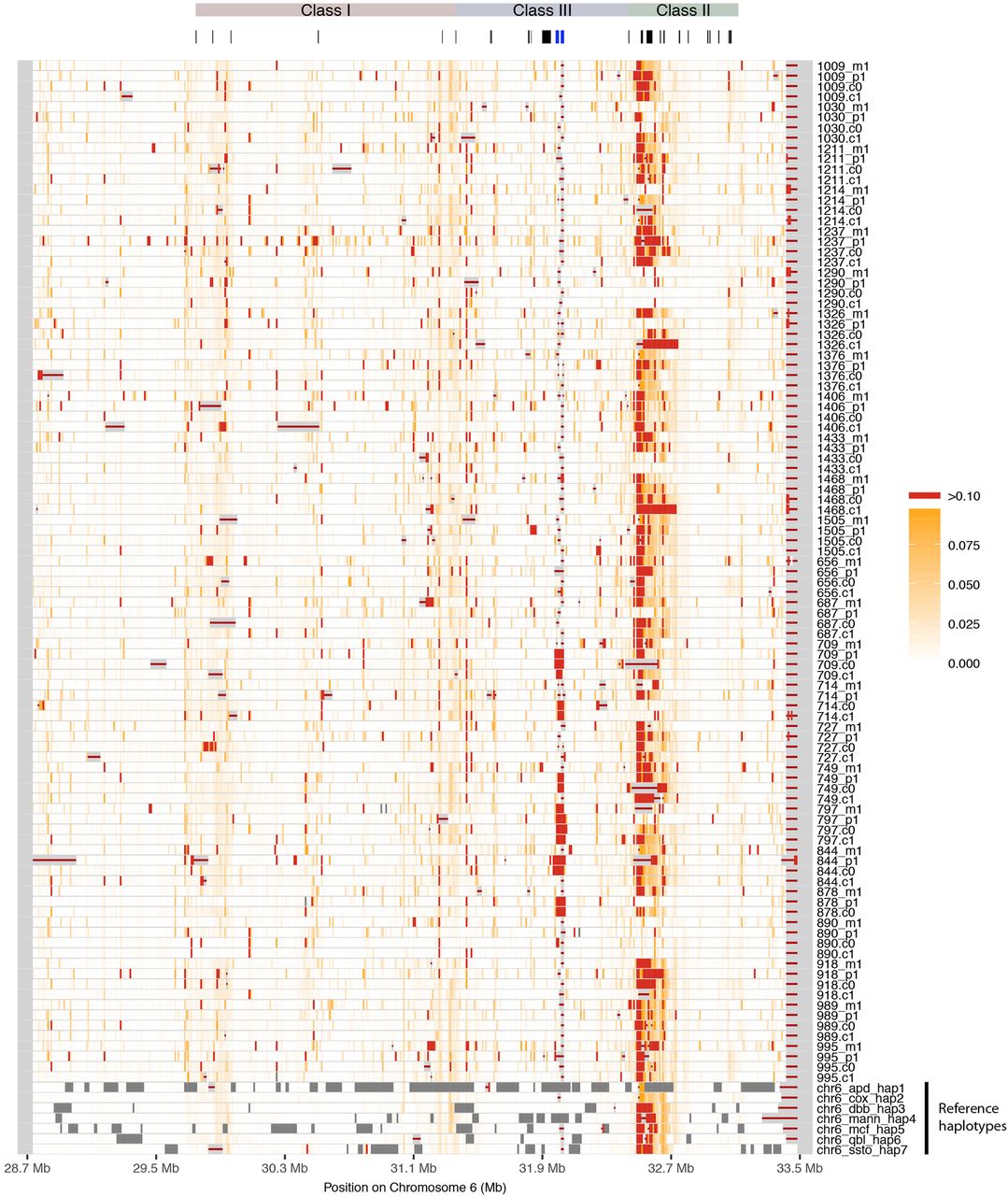 Differences between MHC haplotypes and reference pgf. The new haplotypes and the seven alternative reference haplotypes were aligned to the reference pgf haplotype through pairwise alignment, and the percentage of pairwise differences was calculated in bins of 10 kb, shown here in white (low) to red (high). Dark gray bins contain >50% missing data (i.e., Ns); bins with red line lack alignment blocks. The region classes and important genes such as the classical loci are shown above. C4A and C4B are marked in blue.
