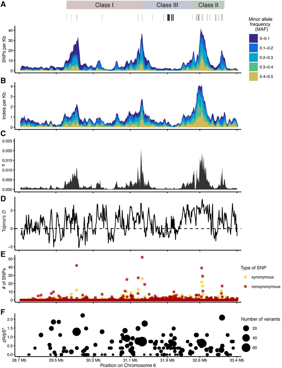 Variation and population genetics. (A,B) Number of SNVs and indels across the MHC region in 50-kb sliding window (step 10 kb). (C) Nucleotide diversity (π) and (D) Tajima's D were calculated in 5-kb sliding windows (step 1 kb). (E,F) Count of nonsynonymous and synonymous SNVs across the MHC region and pN/pS estimated assuming 73% and 27% of sites to be nonsynonymous and synonymous, respectively, calculated as the proportions in the reference pgf haplotype. The MHC classes and important genes, such as classical HLA genes, are marked above.