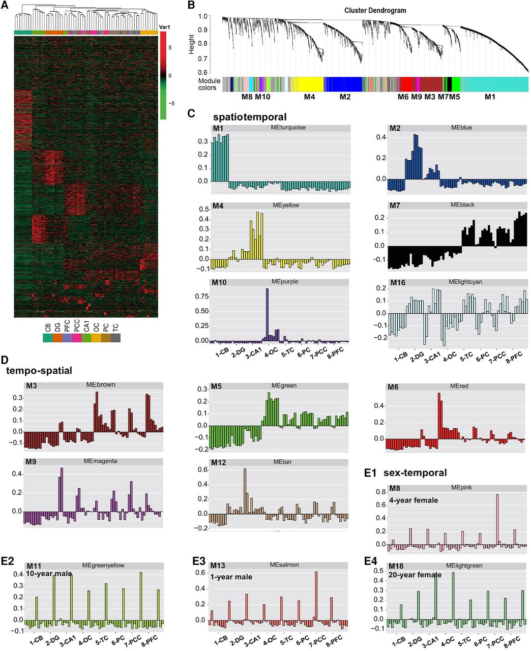 The discrete expression modules of lncRNA expression by the WGCNA analysis. (A) Hierarchical clustering heat map of all differentially expressed lncRNAs (Fig. 2C, right) by samples. LncRNA modules were arranged from 0 (top) to 18 (bottom). (B) Hierarchical cluster dendrogram of all differentially expressed lncRNAs modules. Modules corresponding to branches are labeled with colors indicated by the color bands underneath the tree. (C) Eigengene bar plot of spatiotemporal modules of lncRNAs. Samples were first sorted by brain regions in the order of CB, DG, CA1, OC, TC, PC, PCC, and PFC. In each brain region, samples were then sorted by age (1 yr to 20 yr), and by sex (female and male). (D) Eigengene bar plot of tempo-spatial modules of lncRNAs in the same sample order as in C. (E1–E4) Eigengene bar plot of sex-temporal modules of lncRNAs in the same sample order as in C.