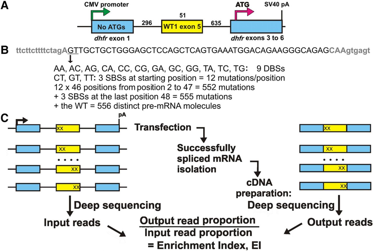 Saturation mutagenesis scheme. (A) Minigene used for splicing studies. The central exon target was Wilms' tumor gene 1 exon 5. All ATG triplets were removed from dhfr exon 1 to minimize the chance of nonsense-mediated decay (NMD). A Kozak ATG sequence was added to dhfr exon 3 to allow mRNA to associate with polysomes. (B) Mutagenesis scheme. At each exon position from 2 to 47, all possible DBSs and SBSs were represented. (C) The input libraries as PCR products and the output libraries as amplified cDNA were deep-sequenced, and the ratio of the relative abundance of these output mutant molecules to the corresponding input abundance was designated the enrichment index (EI).