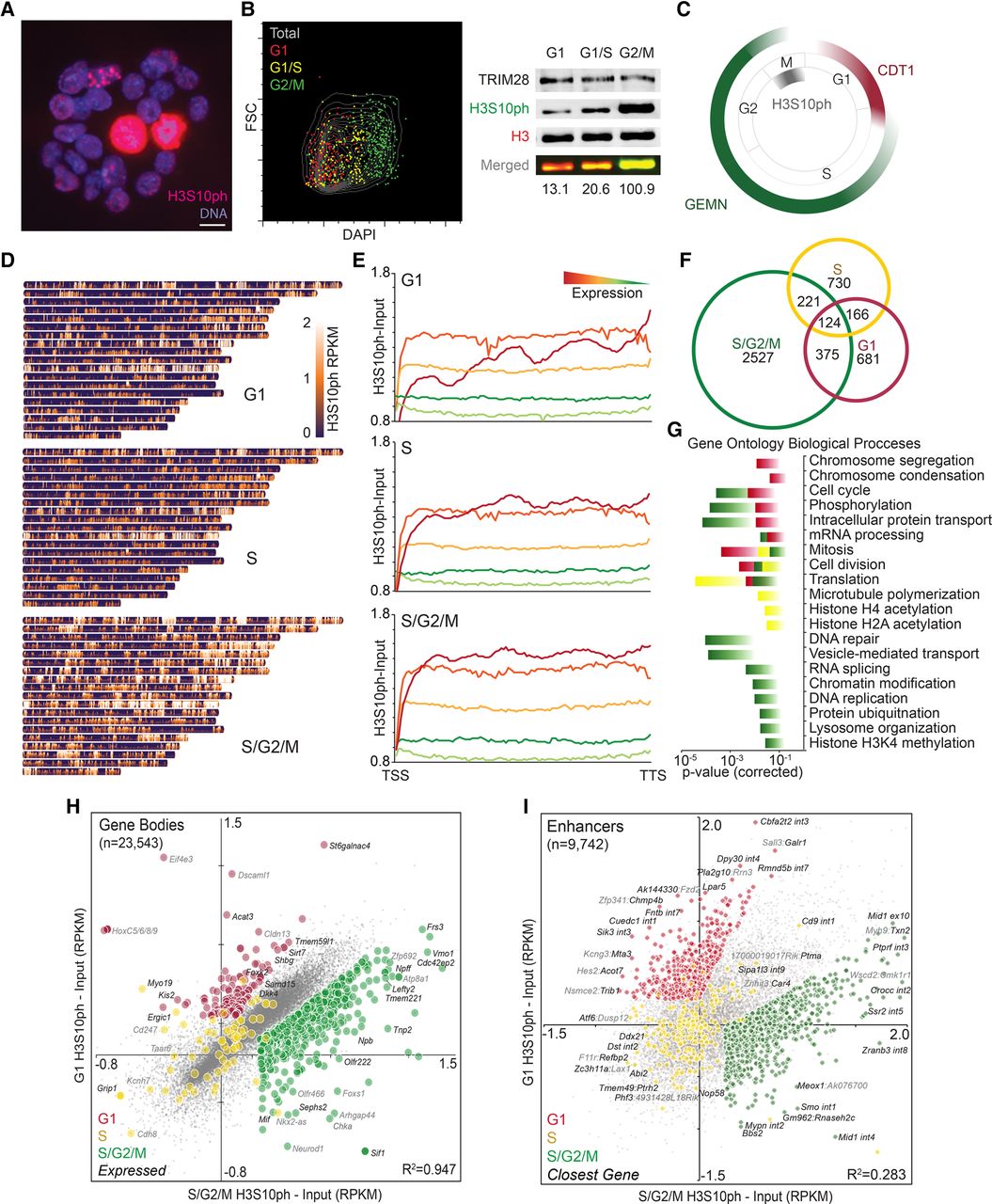 Genome-wide characterization of cell cycle-specific H3S10ph. (A) H3S10ph immunostaining of asynchronous WT TT2 ESCs, counterstained with Hoechst 33342. Scale bar, 10 µm. (B) G1, G1/S, and G2/M ESCs were isolated by FACS based on DNA content (DAPI-staining) and a flow cytometry plot showing the merge of each post-sort purity analysis is shown. Western analysis of whole-cell extract was conducted using H3S10ph- and H3-specific antibodies, and H3S10ph levels were quantified on the Odyssey infrared imager by normalizing to H3 fluorescence level. The percentage of H3S10ph/H3 is shown for each extract. TRIM28 served as a second loading control. (C) Schematic of the FUCCI reporter system for dissection of cell cycle-specific H3S10ph. CDT1-mKO and GEMN-Venus are fluorescent markers of G1 and S/G2/M, respectively. (D) Heat map depicting H3S10ph enrichment across all murine autosomes in G1, S, and S/G2/M sorted fractions. (E) Metagene analysis of normalized H3S10ph enrichment in ESCs (input-subtracted reads per kb mapped [RPKM]) over all ENSEMBL annotated gene bodies, clustered by expression levels in quintiles. (F) Venn diagram of genes enriched for H3S10ph (greater than twofold over input in gene bodies) in G1, S, and S/G2/M sorted fractions. (G) Gene Ontology of Biological Processes from genes identified as in E (Bonferroni corrected P < 0.05). (H) Pair-wise comparison of H3S10ph enrichment (input-subtracted RPKM) over all gene bodies in G1 vs. S/G2/M sorted fractions. Colored dots represent genes with cell cycle skewing (z > 0.5). R2 = Pearson correlation. (I) Pair-wise comparison of H3S10ph enrichment (input-subtracted RPKM) over annotated enhancer regions in G1 vs. S/G2/M sorted fractions. Colored dots represent sites with cell cycle skewing as in G. A subset of enhancers is labeled with the overlapping gene(s), exon (ex), intron (int), or flanking gene(s) with the closest gene in black.