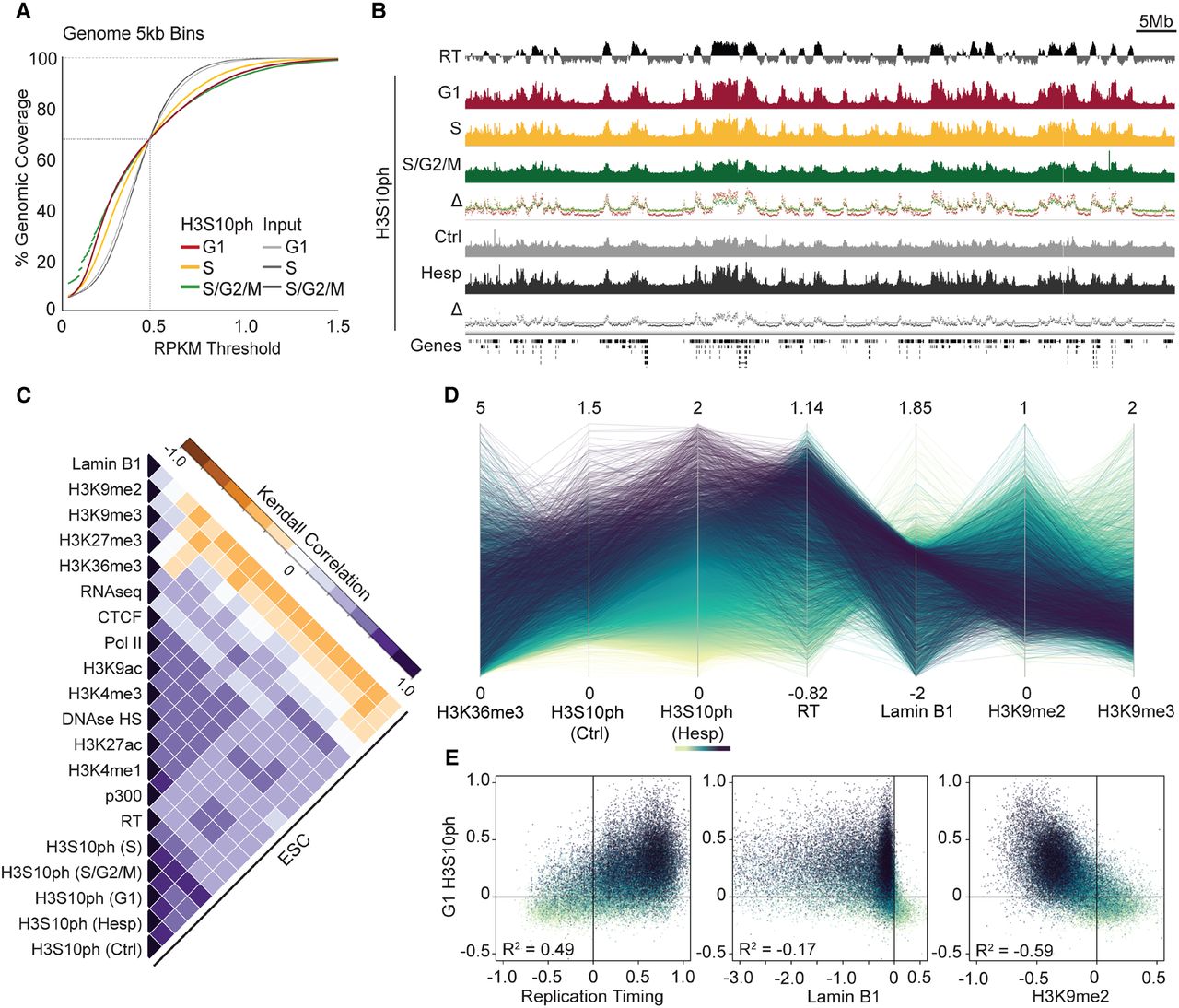 Interphase H3S10ph forms domains highly concordant with replication timing. (A) Cumulative distribution frequency plot of ESC H3S10ph ChIP vs. input libraries in 5-kb bins. (B) Genome browser screenshot of H3S10ph enrichment and replication timing (RT) (Hiratani et al. 2010) in TT2 ESCs across Chr 18. (C) Kendall correlation matrix of H3S10ph with chromatin features (see Supplemental Table S2 for data sets analyzed) across 5-kb genomic bins in ESCs, following unsupervised hierarchical clustering. H3S10ph ESC data sets include sorted FUCCI subpopulations (S, S/G2/M, and G1), Hesp-treated, and vehicle control (Ctrl). (D) Parallel coordinate comparison of H3S10ph enrichment (RPKM) with histone marks H3K36me3, H3K9me2, and H3K9me3 as well as Lamin B1 and RT in randomly sampled 5-kb bins. Heat map color-coding is based on H3S10ph enrichment in Hesp-treated ESCs. Note the strong positive correlation between H3S10ph in interphase and RT and the negative correlation with H3K9me2. (E) Pair-wise comparisons of G1 H3S10ph enrichment with RT, LADs, and H3K9me2 (input subtracted RPKM) enrichment. Randomly sampled 5-kb bins are colored as in D. R2 = Pearson's correlation.