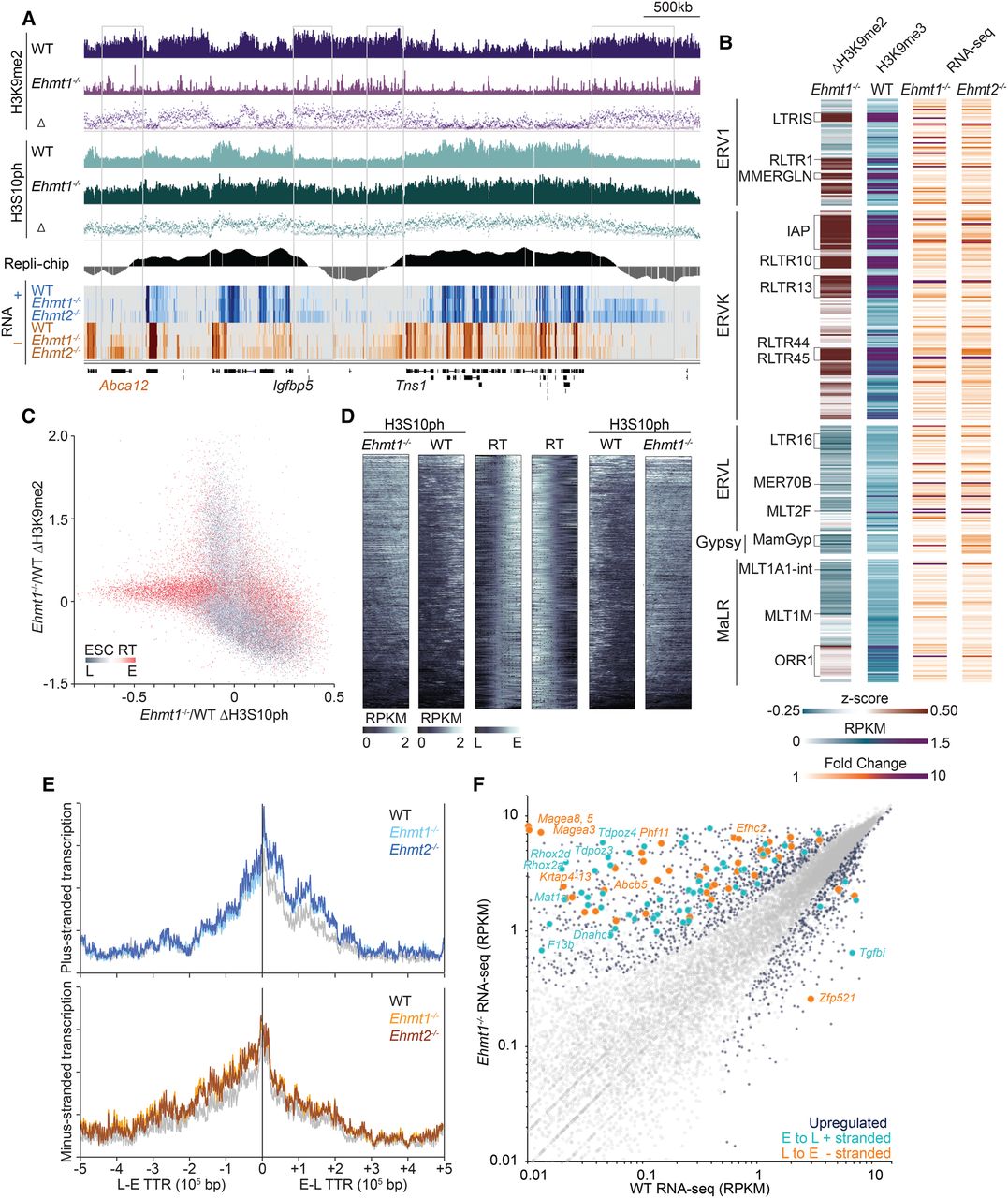 EHMT1 restricts spreading of H3S10ph and inhibits aberrant transcription near TTRs. (A) Genome browser screenshot of a region on Chromosome 1 showing H3K9me2, Hesp-treated (H+) H3S10ph, and strand-specific RNA-seq in WT and Ehmt1−/− ESCs. (B) Heat maps of the change in H3K9me2 enrichment in Ehmt1−/− vs. WT (z-score), H3K9me3 enrichment (RPKM) in WT, and differential expression in Ehmt1−/− vs. WT ESCs for all LTR transposable element subfamilies present at >100 copies in the reference mouse genome. (C) Scatterplot showing the changes in H3K9me2 and H3S10ph coverage in Hesp-treated Ehmt1−/− ESCs relative to WT, overlaid with ESC RT status of the genomic bins as a heat map (red: early; gray: late). In Ehmt1−/− ESCs, late-replicating regions concurrently lose H3K9me2 and gain H3S10ph. (D) Heat map of H3S10ph enrichment in Hesp-treated WT and Ehmt1−/− ESCs over 500 kb centered on all RT transition boundaries in WT ESCs (RT data from Yokochi et al. [2009]). (E) Cumulative density plot of RNA-seq coverage on the plus (top plot) and minus (bottom plot) strands at TTR boundaries (0–500 kb) in WT, Ehmt1−/−, and Ehmt2−/− ESCs. Note the increase in RNA coverage in the mutant lines on the plus strand in early to late transition regions and the minus strand in late to early transition regions. (F) 2D scatterplot comparing genic transcription in Ehmt1−/− and WT ESCs. Note that many of the genes up-regulated in Ehmt1−/− ESCs reside within RT transition boundaries (0–500 kb) and show a RT orientation strand-bias consistent with that described in E.